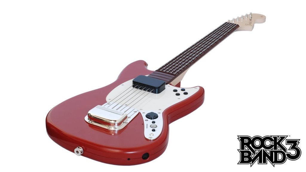 Rock Band 3's paradepaardje wordt de Fender Mustang Pro-Guitar. Deze draadloze gitaar heeft maar liefst 102 knoppen op de nek, een knop voor elkeen van de 17 frets voor alle 6 snaren. De strumbar wordt vervangen door zes échte snaren. Dit prachtig stukje hardware zal 150 dollar kosten.