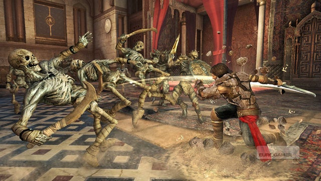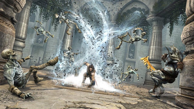 Na een tijdje krijgt de prins ook magische krachten ter zijner beschikking. Deze dienen voornamelijk om wat variatie aan spelers te geven, hier en daar zijn ze ook verplicht om de puzzels verder te zetten…maar echt ingrijpend verandert dit de game niet. Ook de combat geraakt niet goed los en de vijanden zijn ongeïnspireerd. Bij gebrek aan leuke en uitdagende tegenstanders heeft men het adagio ‘meer is beter’ gevolgd en dus word je in elke grote kamer overstelpt door een horde wezens. Niemand blinkt uit en met je zwaardaanvallen maai je er meerdere tegelijk weg. Je aanvallen zijn trouwens behoorlijk beperkt gebleven: je vecht met je zwaard en hebt slechts één grote aanval. Je kan indien je dit wenst nog wat springen en stampen of voor een mooie grafische kill gaan wanneer je nabij een muur of afgrond staat, maar daar houdt het dan ook meteen mee op.