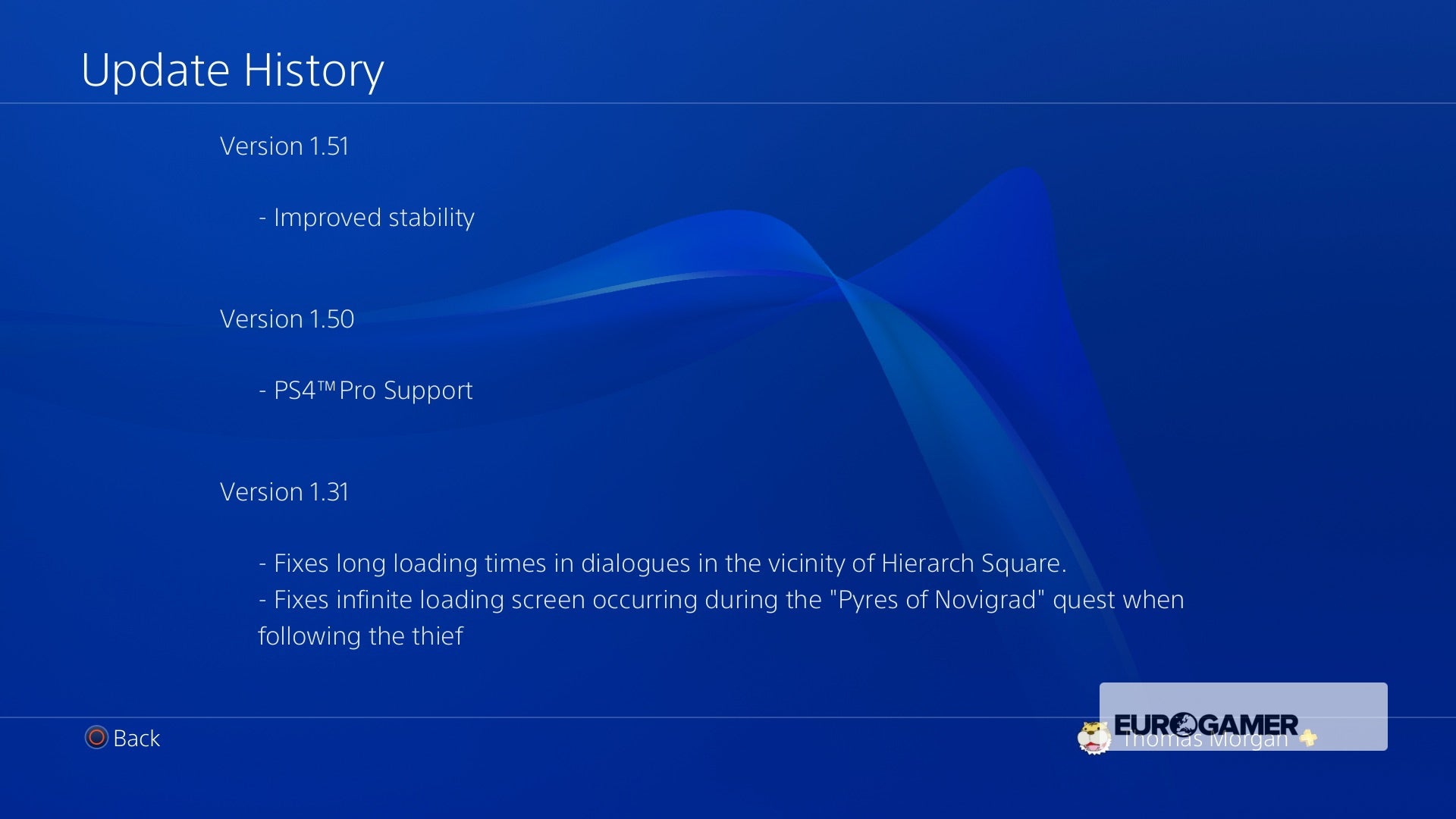 Update 1.50 biedt 4K-ondersteuning en 'laat de game iets beter lopen', aldus ontwikkelaar CD Projekt RED. Update 1.51 volgde kort hierop en verbetert de stabiliteit tijdens het spelen.