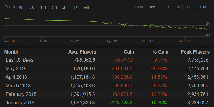 In januari bereikte PUBG zijn hoogtepunt met een gemiddelde van 1,5 miljoen spelers en een piek van 3,2 miljoen spelers. Sindsdien is het aantal actieve spelers echter bijna gehalveerd. De afgelopen maand waren er nog gemiddeld bijna 800.000 spelers, met een piek van 1,7 miljoen spelers.