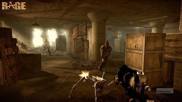 Een stuk interessanter is het maken van je eigen ‘weapons of destruction’, één van de weinige, subtiele RPG-elementen die we in Rage terug vinden. Er zijn een heleboel voorwerpen te verzamelen in de game, dus bereid je maar voor om in complete zwerver-stijl elk krat, lijk en vuilnisbak te doorzoeken. Hoe dan ook, deze objecten, gecombineerd met blauwdrukken die je hier en daar kunt verkrijgen, laten je toe allerlei leuke speeltjes te creëren. Zo heb je speciale explosieven, turrets op spinnenpootjes, RC-autootjes die ontploffen en nog van dat lekkers.