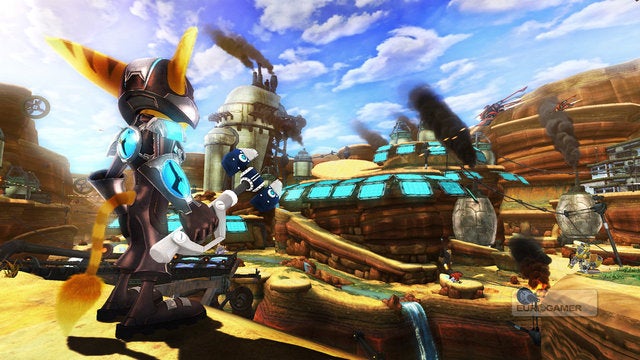 Ook Ratchet komt aan zijn trekken, hij krijgt geleidelijk aan meer en meer funky gadgets en wapens waardoor de gameplay een nieuwe hoogte inschiet. De wapens breiden zijn arsenaal uit waardoor je sneller situaties naar je hand kan zetten. Denk maar aan een serie bommen die in een radius ontploffen, ideaal om snel komaf te maken met vijanden rond je heen. Er zijn ook Tesla spikes, statische polen…euh palen waartussen je een elektrisch veld spant, de Spiral of Death die een boomerang blade afschiet waarmee je vaak twee keer je vijand kan raken. Ook heel wat dolkomische wapens maken hun opwachting zoals de Groovitron Glove die discoballen afschiet waarbij zelfs je allies beginnen te dansen en de immer charismatische Mr. Zurkon die met zijn citaten alleen al voor een 18+ rating zou kunnen zorgen. De RYNO die vrolijk een klassieke ballade begint af te spelen wanneer je hem afvuurt zit er terug in. Ook Rift Inducer 5000, een tool die een rift opent naar een andere dimensie waaruit allerlei tentakels schieten om je vijanden mee te sleuren en één van de meest gehanteerde wapens is de nieuwe Sonic Eruptor, een grote kikker die luidkeels boert om vijanden weg te blazen.