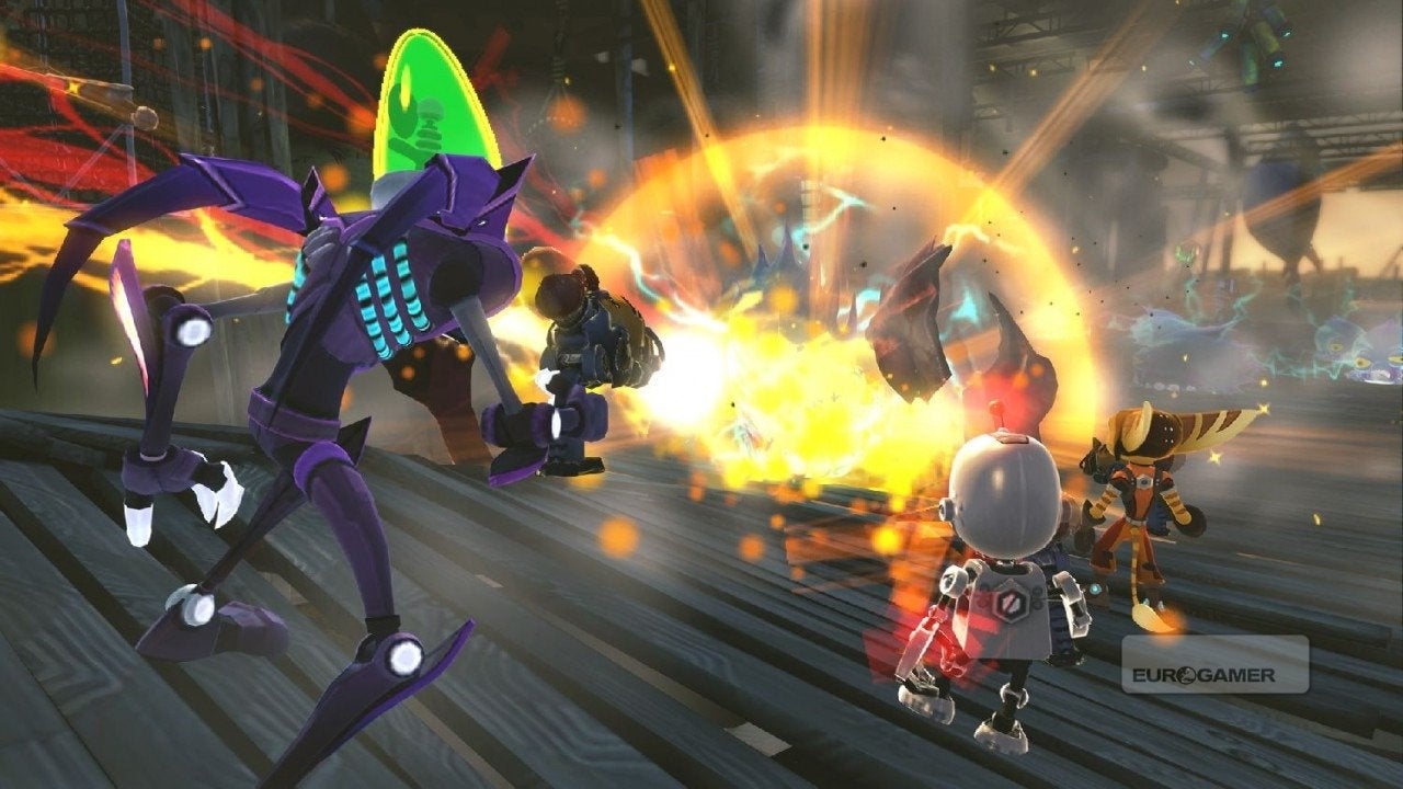 Niet onbelangrijk om weten is dat Ratchet & Clank zowel offline als online speelbaar is. Via een oersimpel matchmaking systeem heb je meteen drie spelers te pakken om via het internet levels uit de campagne te spelen. Staat je PS3 niet in verbinding met het wereldwijde web, dan kun je vier controllers aan één console aansluiten om lokaal je ding te doen. Geen vrienden? Geen probleem, want ook in je eentje valt Ratchet & Clank samen met een door de computer bestuurde partner te spelen. Een groot stuk van het coöperatieve charme gaat dan spijtig genoeg verloren, maar zelfs in je eentje is All 4 One een toffe ervaring om meegemaakt te hebben.