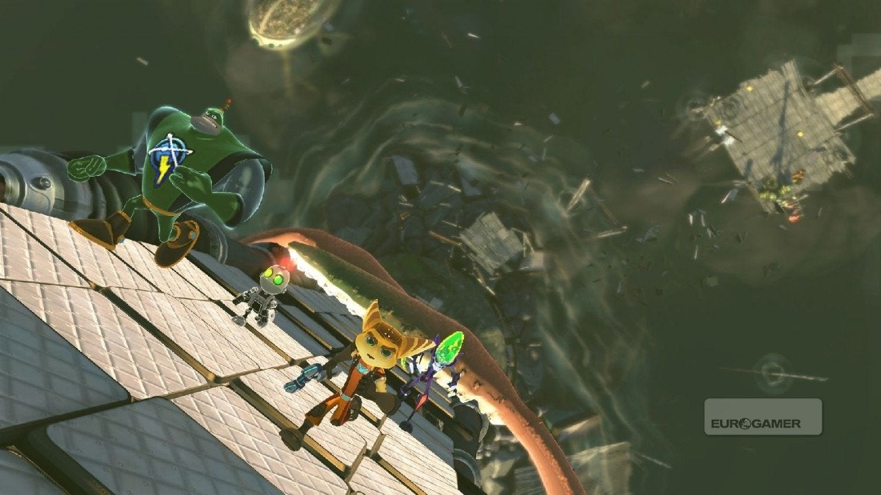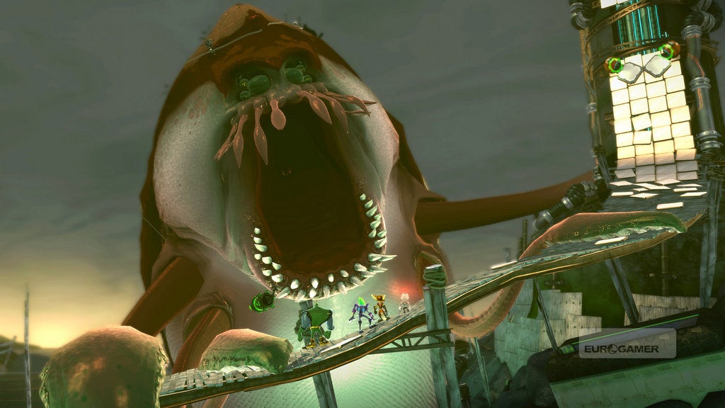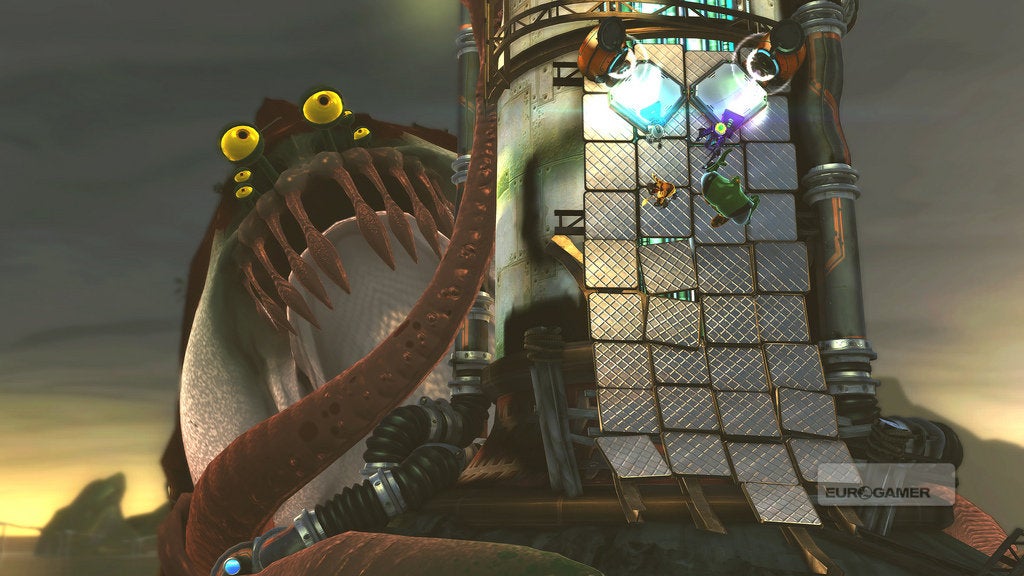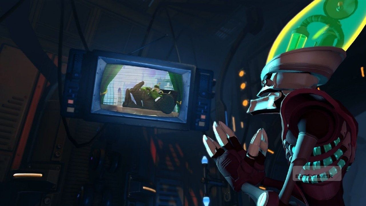 Ratchet & Clank: All 4 One flirt soms zelfs met de echt inventieve puzzelgames in de vorm van een handvol challenge rooms. Hierin moet je een beestje dat op de achtergrond in glazen buizen loopt tot aan de finish brengen door op de voorgrond tijdig hendels over te halen en knoppen in te drukken. Wanneer je coöperatief speelt moet je rekening houden met de timing waarop je dat doet, want anders sterft het beestje een gruwelijke dood en verdien jij geen beloning. We hadden graag wat meer van deze vermakelijke challenge rooms in het spel gezien, maar Insomniac wou er duidelijk geen rasechte puzzelgame van maken.