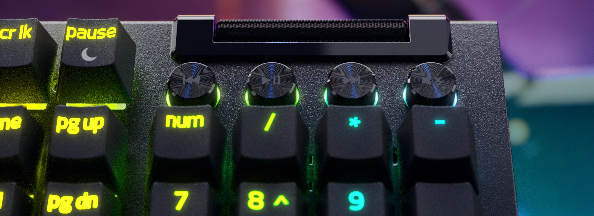 De Razer Blackwidow V4 Pro heeft haast meer functies dan je er gebruiksredenen voor kunt bedenken. Rechtsboven zitten vier mediatoetsen (pauzeren, muten, vooruit en achteruit skippen) en de zogenaamde ‘multi-function roller’. Standaard staat die ingesteld om je volume aan te passen. Dit is bovendien het toetsenbord bij uitstek als je macro’s wilt programmeren. Links heb je een verticale rij macrotoetsen. Helemaal links, op de zijkant van het chassis zelf, zitten er nog eens drie macrotoetsen. En linksboven heb je tot slot de Razer Command Dial-draaiknop, die je door door verschillende modi laat schakelen (bv. in- en uitzoomen, de helderheid van het toetsenbord, etc.). Met zo veel extra herprogrammeerbare knoppen kun je zowel qua gaming als productiviteit inventieve shortcuts opstellen die je ontegensprekelijk een voordeel geven. De Razer Synapse-software is bovendien zo gebruiksvriendelijk dat macro’s instellen zelfs voor nieuwkomers toegankelijk is.