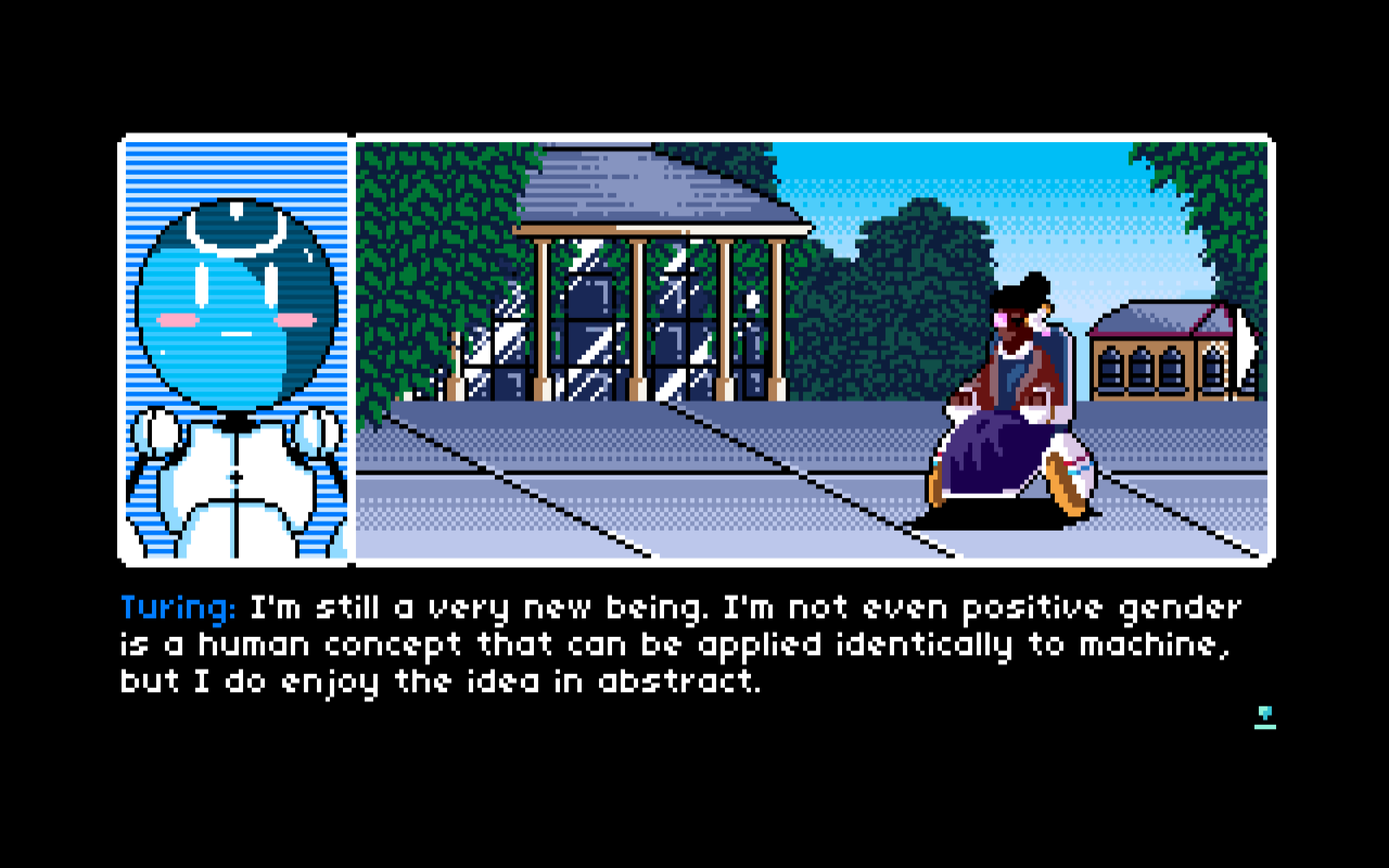 Toch zorgt het geheel voor een overtuigende ervaring. Dat is voornamelijk te danken aan de wijze waarop de point-and-click adventure liefhebbend en zelfbewust met alle conventies van het genre speelt. Een noir-detective die zich afzet tegen technologische modernisering als een soort nostalgische hunkering naar authenticiteit. De androïde Turing die zijn eerste stappen richting individualisme zet door zich te meten met de menselijke interacties uit zijn omgeving. Het is allemaal zo bekend, doch zo sterk gepresenteerd dat het boven de clichés uitgroeit.
