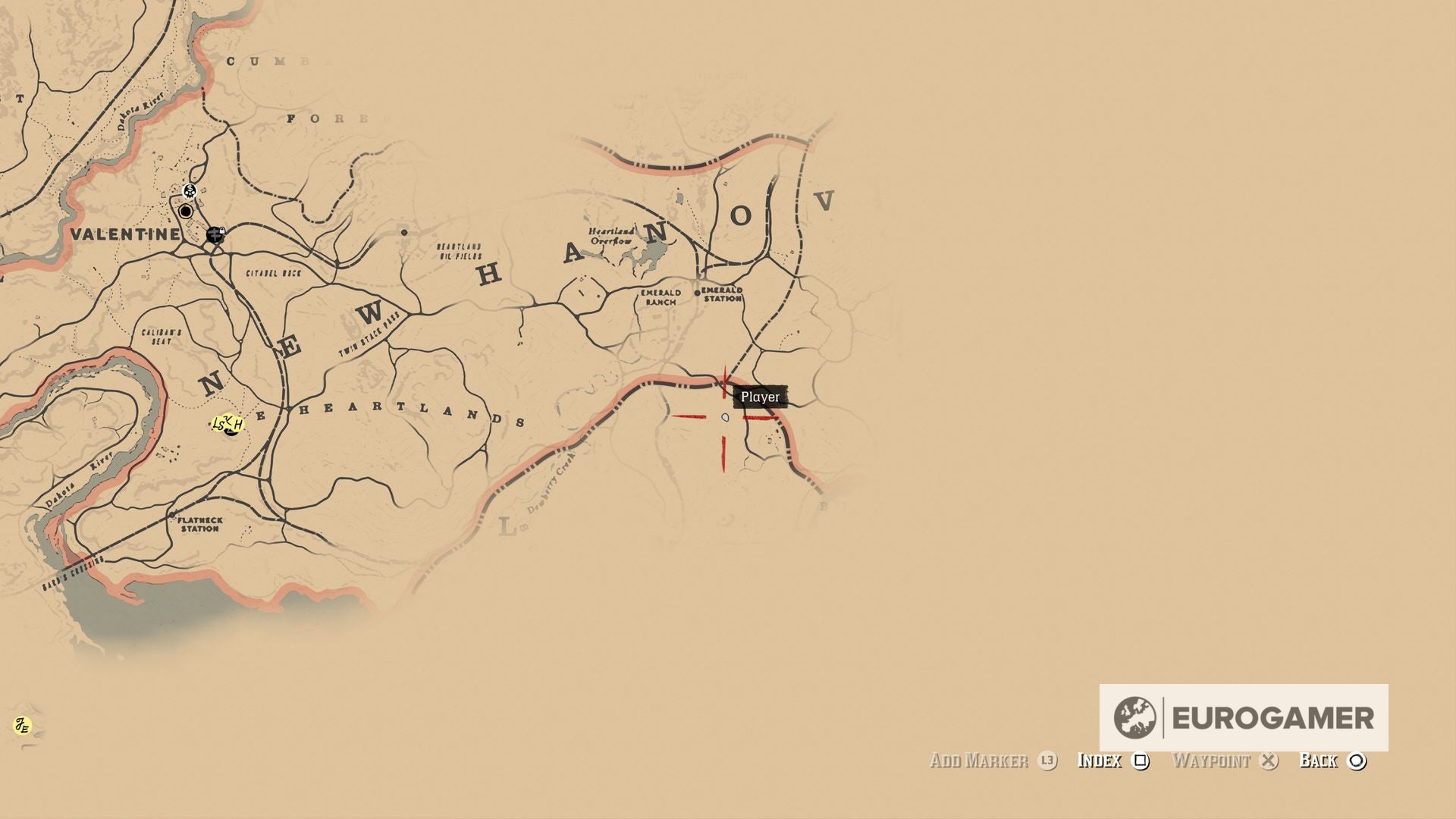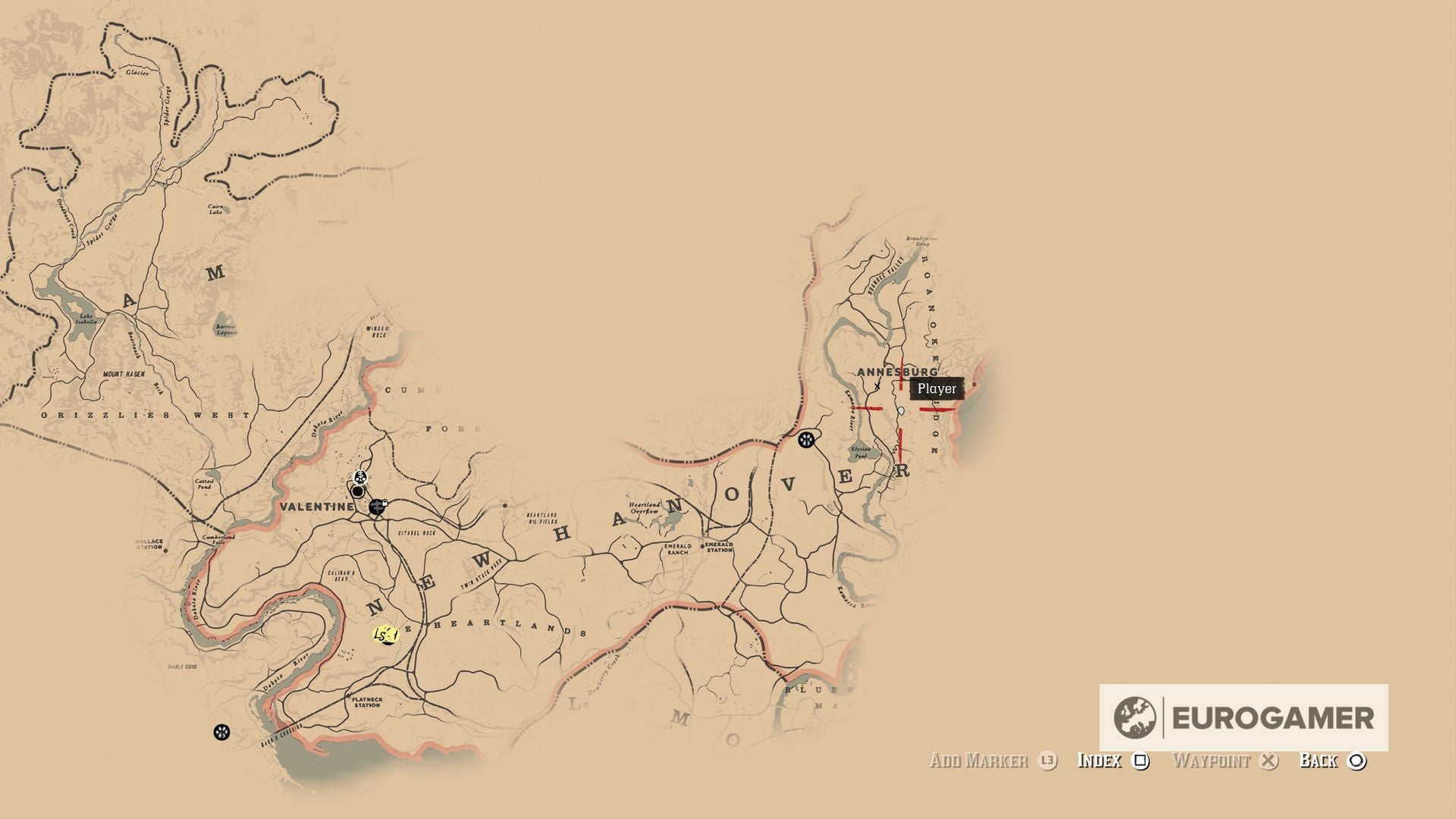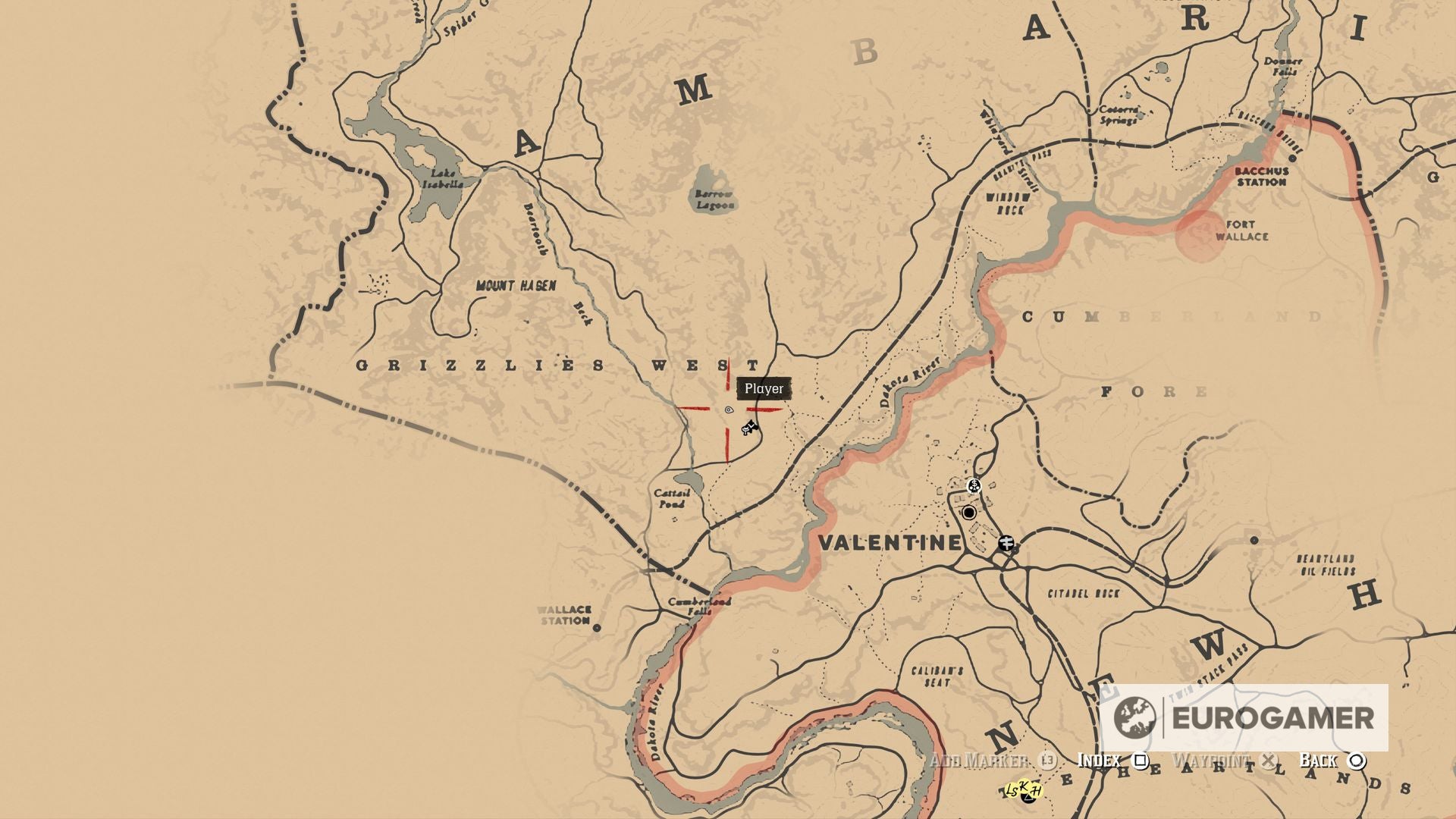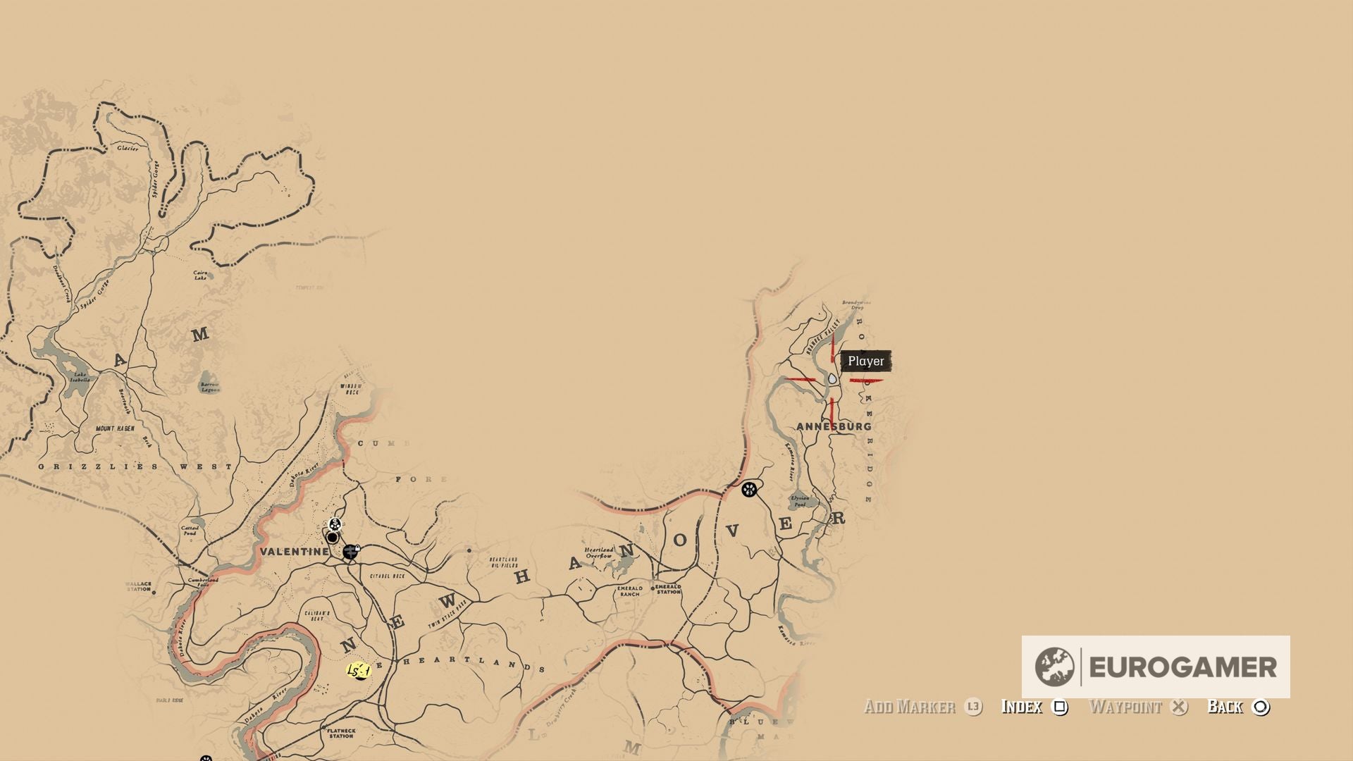 Om naar de eerste Dreamcatcher te gaan, open je het beste de map. Onder de letter E in Valentine loopt een gestippelde route (zie afbeelding). Vanaf het derde streepje van onder ga je iets naar het westen. Gebruik de Dead Eye om de dromenvanger makkelijker te herkennen.