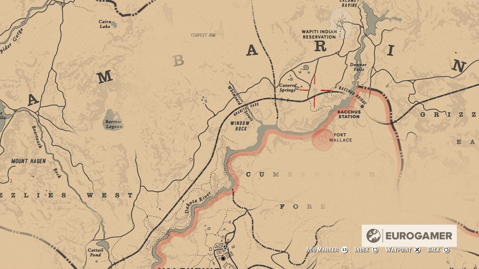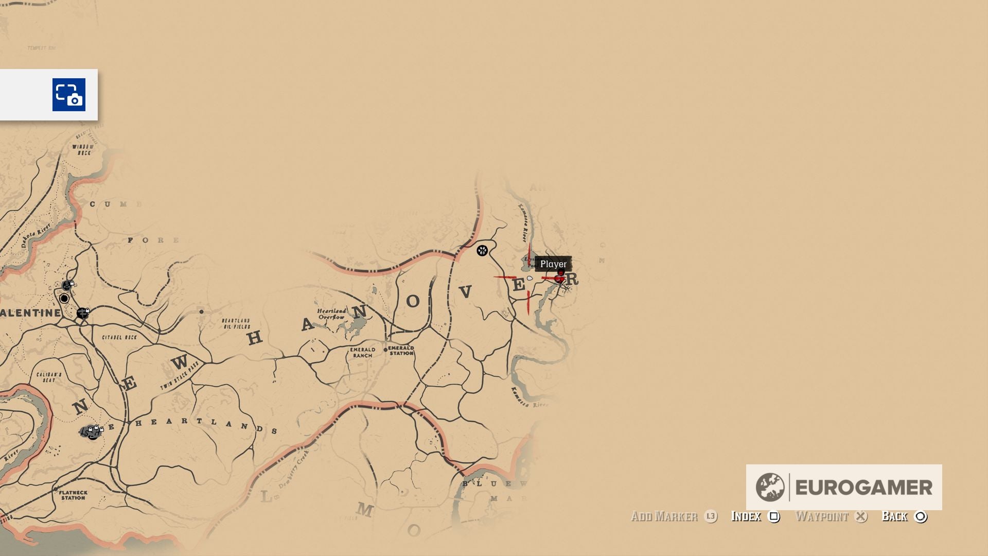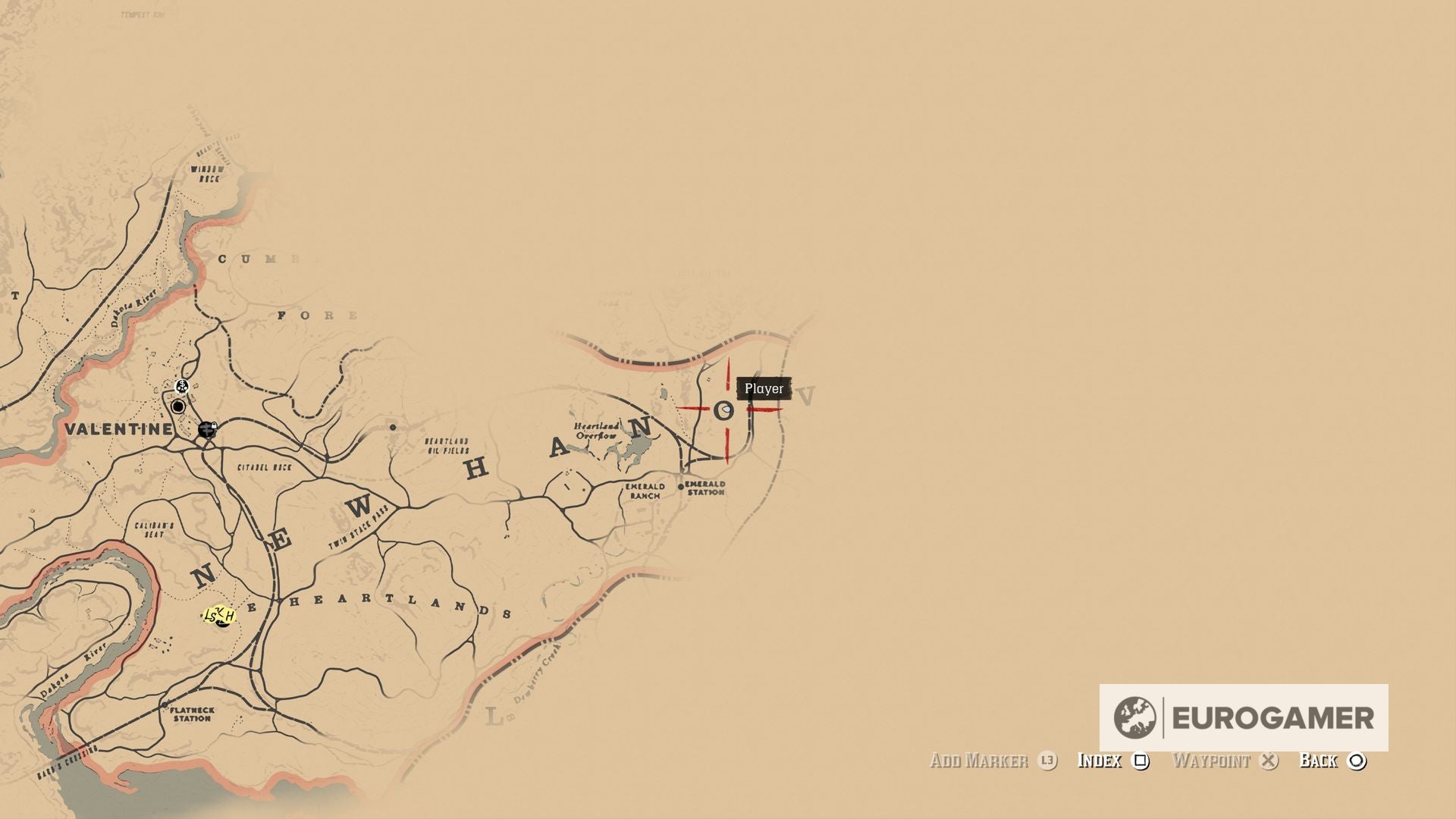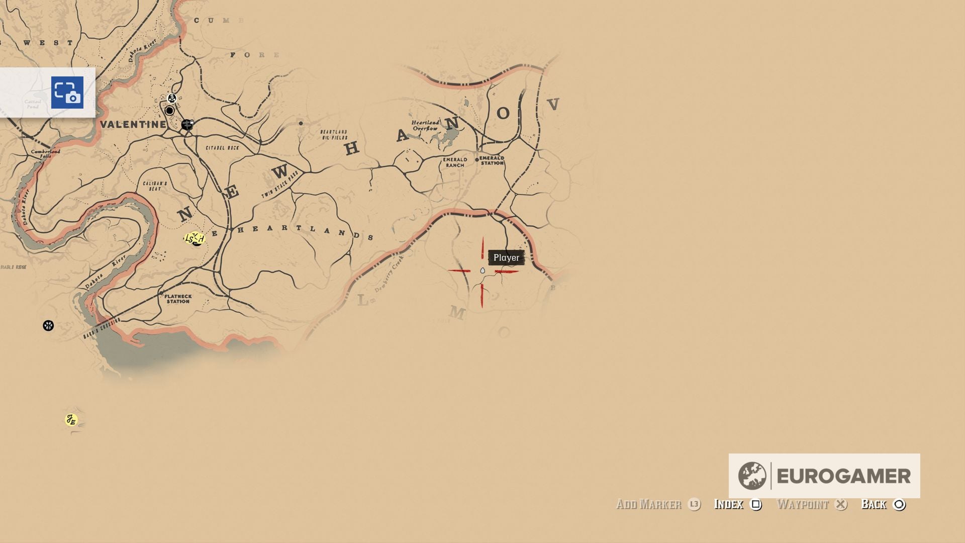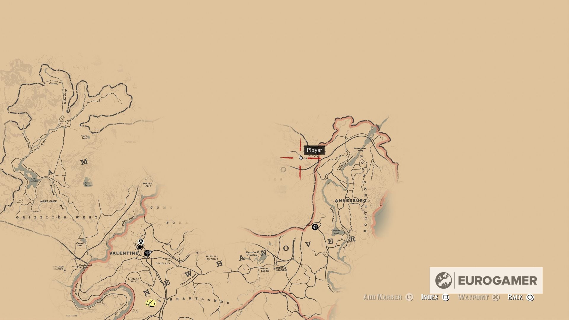 Om naar de eerste Dreamcatcher te gaan, open je het beste de map. Onder de letter E in Valentine loopt een gestippelde route (zie afbeelding). Vanaf het derde streepje van onder ga je iets naar het westen. Gebruik de Dead Eye om de dromenvanger makkelijker te herkennen.