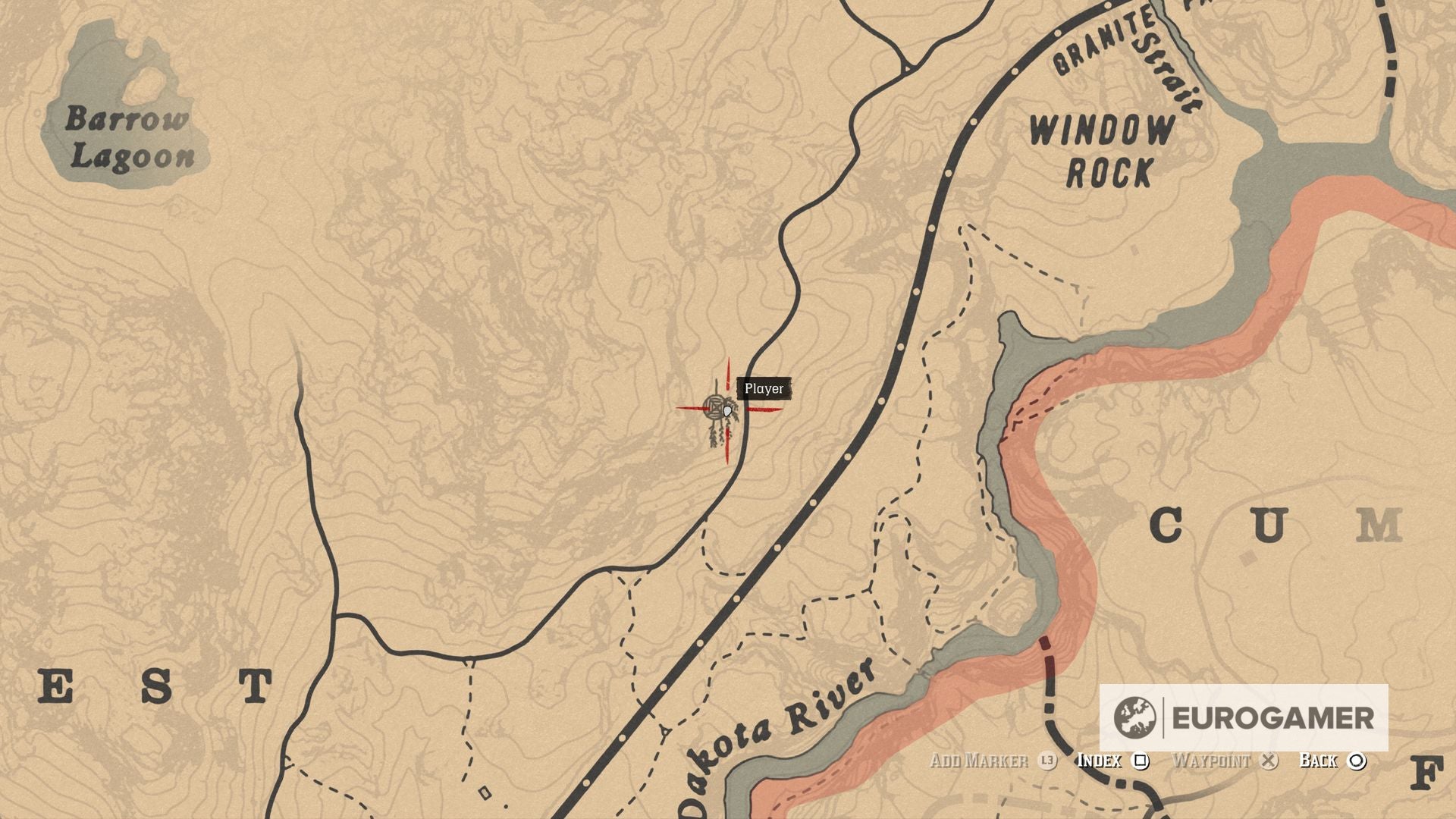 De derde Dreamcatcher vind je op de zuidelijke oever van de Dakota River, net ten zuiden van de Legendary Fish locatie. Terwijl je langs de oever naar het zuiden rijdt, zie je een richel met uitzicht op de rivier. Gebruik je Dead Eye op de locatie. De volgende dromenvanger vind je op de top van de bergkam.