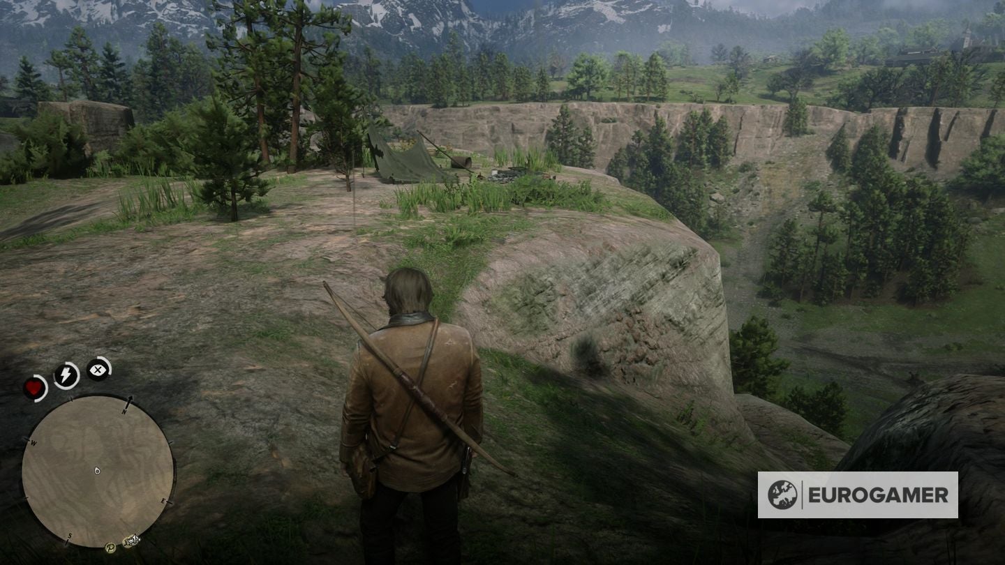 Ga verder het plateau op en je komt een kamp tegen rechts van je. Vlak daarvoor helt de bergtop omlaag naar rechts. Volg die weg.