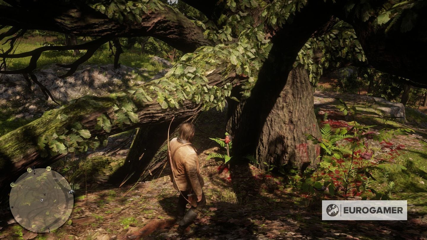 Als je van uit het noorden het pad afgaat, kijk dan naar rechts om een bloedspoor te zien. Het leidt je naar een boom.