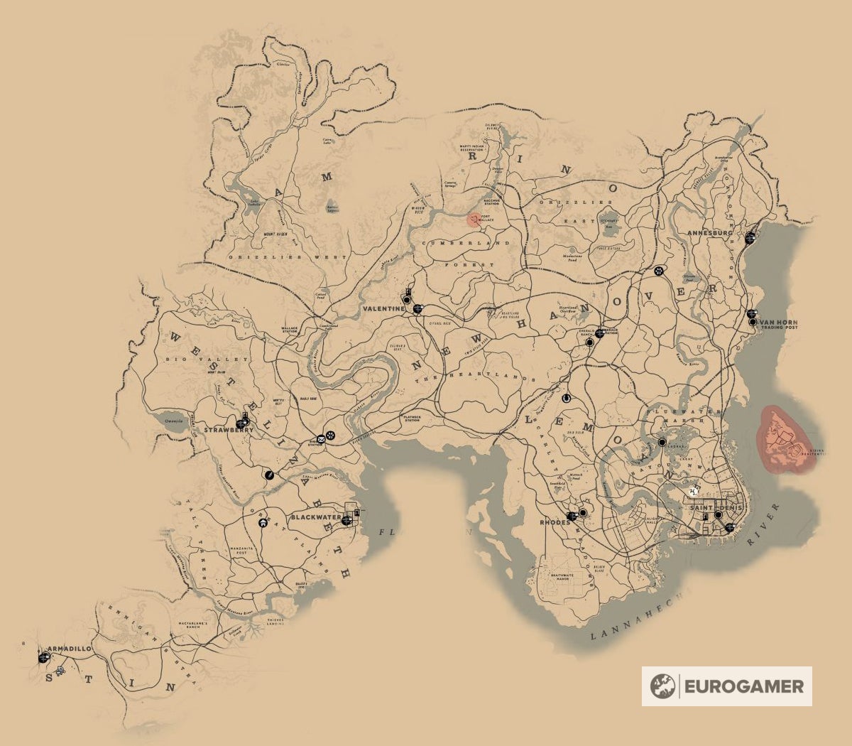 De Red Dead Redemption 2 map hieronder is wat wazig omdat ze van de officiële Duitse guide book is ingescand. Maar de scans beantwoorden wel enkele belangrijke vragen.