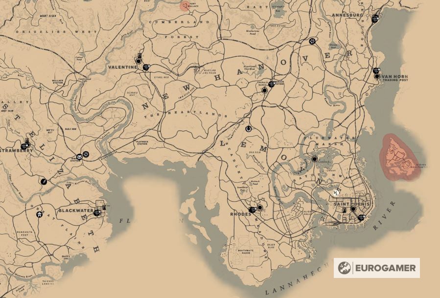 Als we naar het zuidoosten van de map kijken komen we aan het einde van onze rondleiding. Hier vind je Saint Denis, de grootste stad in de game. Hier vind je vrijwel alles. Deze plek zal zeker indruk op je maken.