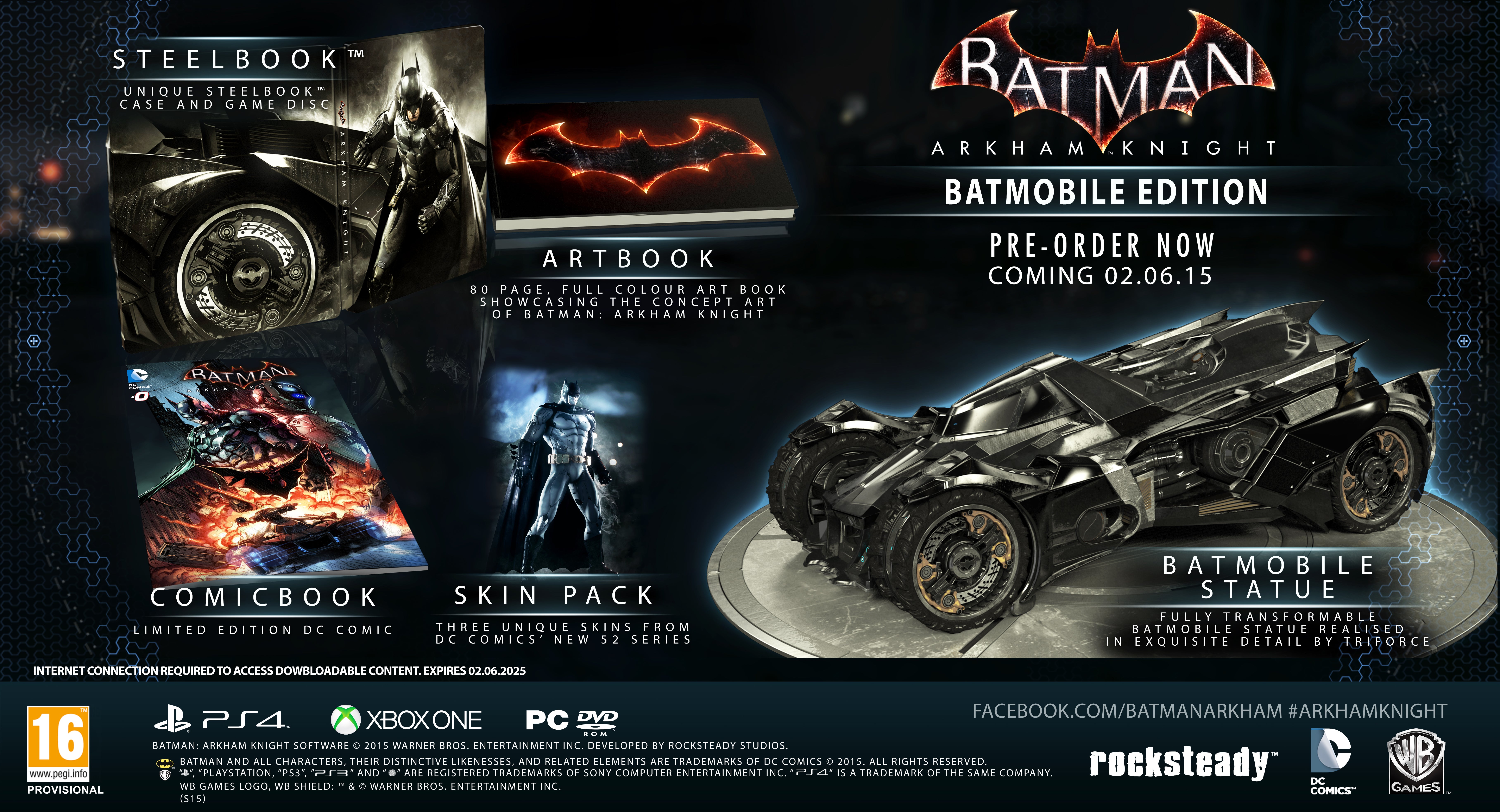 Daarbij kondigt het bedrijf ook twee collector's edities aan, namelijk de Limited Edition en de Batmobile Edition. De eerste bevat een tachtig pagina-tellend Custom Art Book, een unieke steelbook, een Arkham Knight comicboek, een exclusieve Skin Pack en een Batman Memorial-standbeeld. Deze editie wordt verkocht voor €119,99 op de consoles en voor €99,99 op de pc.