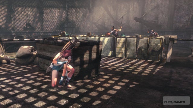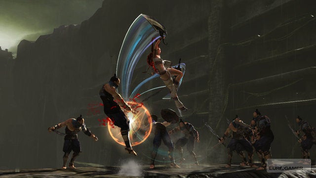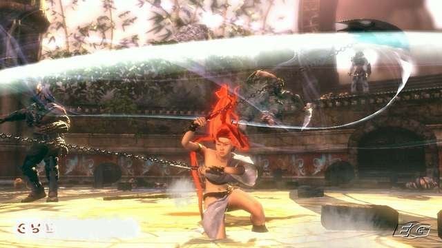 Als Nariko kun je een heleboel extreme aanvalsbewegingen uitvoeren, die elk voortvloeien uit een van de drie vechtstijlen. Je hebt de reguliere set aan attacks waarbij je gewoon je standaard zwaarden gebruikt, maar druk je de L1 of R1-knop in, dan maken de moves die aan die stijl gekoppeld zijn plaats voor nieuwe bewegingen. Zo is er een setje snelle aanvallen waarbij Nariko rond gaat zwaaien met zwaarden die vastzitten aan kettingen (we weten wat je nu denkt), terwijl de andere tactiek ervoor zorgt dat onze rosse schone met het heavenly sword zelf gaan aanvallen. Die laatste stijl is vooral handig tegen vijanden die schilden dragen, omdat het zwaard door zowat alles uit kan klieven. Het nadeel is natuurlijk dat je aanvallen erg traag zijn en je dus nét dat tikkeltje langer kwetsbaar bent voor een tegenaanval.