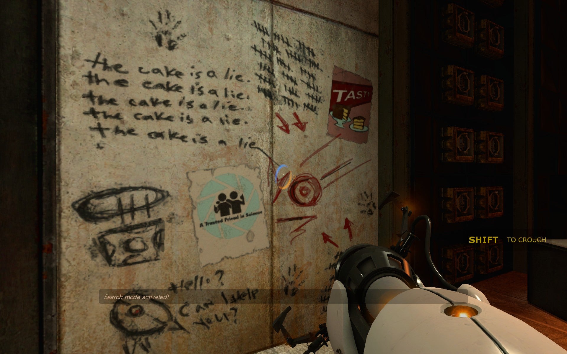 De manier waarop het plot verteld wordt, is op z'n minst ook een vermelding waardig. Het is altijd leuk om een ander verhaalmechanisme te zien dan ellenlange dialogen of - God help ons - muren van tekst. Wel, oké, om eerlijk te zijn gebruikt Portal wel muren van tekst, zij het in een meer letterlijke betekenis. Doorheen de testkamers zal de dialoog van GLaDOS al duidelijk maken dat er iets niet pluis is. (Wel, dat, plus het feit dat de testkamers levensgevaarlijk zijn.) Een bevestiging voor dit alles is te vinden in allerhande krabbels en aantekeningen die je vindt op de muren. Het lijken haast easter eggs, verborgen op plaatsen waar je eigenlijk niet mag komen. Toch zijn ze haast essentieel voor het verhaal en dat maakt het natuurlijk des te interessanter.