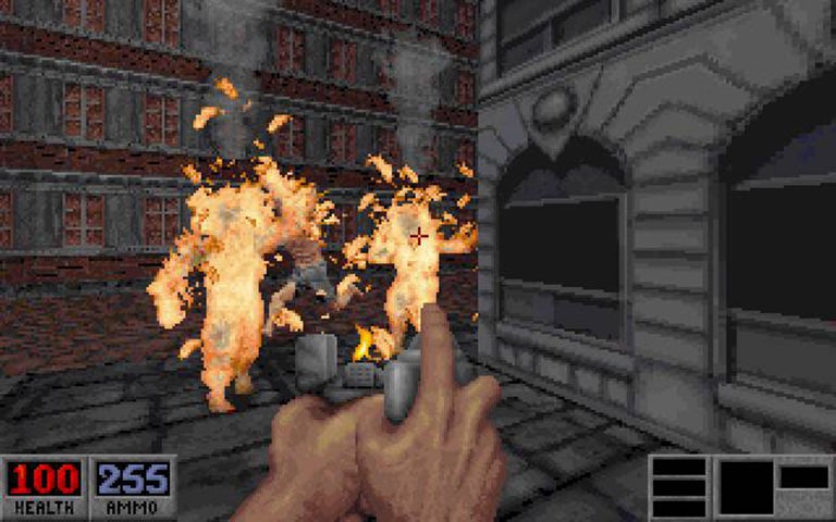 Maar het zijn niet alleen de levels waardoor je Blood wilt blijven spelen. Dankzij een gevarieerd aanbod aan agressieve vijanden en een gestoord arsenaal aan wapens zijn de gevechten ongekend intens en uiterst brutaal. Fanatieke Cabal-leden gooien bundels dynamiet, schieten met tommyguns en jagen op je terwijl ze je in hun eigen taaltje uitdagen. Gargoyles liggen op de loer en vallen onverwachts grommend vanuit de lucht aan of proberen je in de val te lokken door zichzelf als standbeeld te vermommen. Alsof dat nog niet genoeg is, dien je ook met Phantasms rekening te houden: Magere Heinen die met hun ijzige gegil je ziel komen halen en alleen kwetsbaar zijn wanneer ze met hun zeis of magische schedels aanvallen.