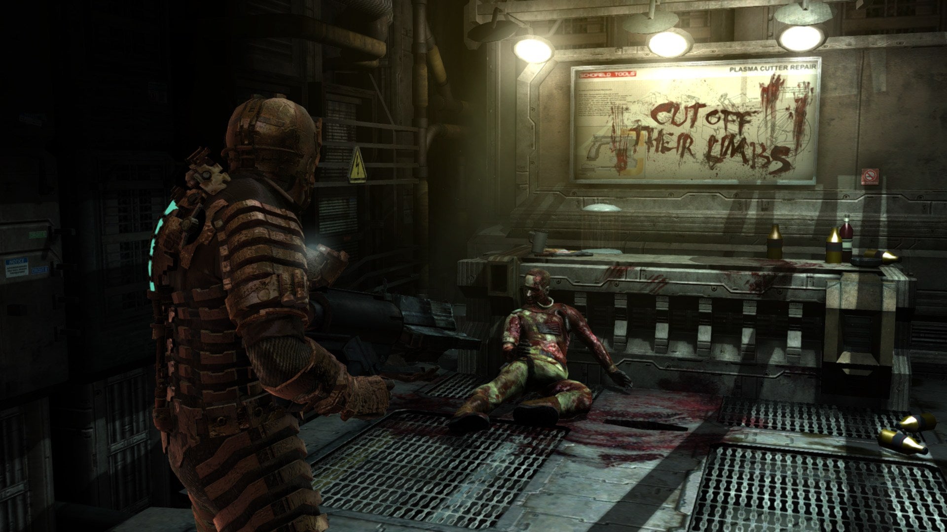 Het is vooral op de momenten waarop het bloed rijkelijk vloeit dat het voor spelers met een zwakke maag misselijkmakend wordt. Rondzwevende lichaamsdelen in ruimtes zonder zwaartekracht en rood besmeurde muren vallen nog wel mee. Het is juist het feit dat Necromorphs op mensen lijken, hoe gemuteerd dan ook, dat voor een extra psychologisch effect zorgt. Je staat immers wel een baby in stukken te zagen, inclusief het bloed en sappige geluid dat daarmee gepaard gaat. De sterfanimaties winden er ook geen doekjes om. Zo word je regelmatig in tweeën gehakt. Je kunt echter ook worden aangevallen door een hoofd met tentakels dat jou niet alleen onthoofd, maar ook je ruggengraat overneemt en je in een wandelende zombie verandert. Zelfs de gebeurtenissen op het schip blijven je nog lang bij, zoals de eerste keer dat je een lijk gereanimeerd en gemuteerd ziet worden.