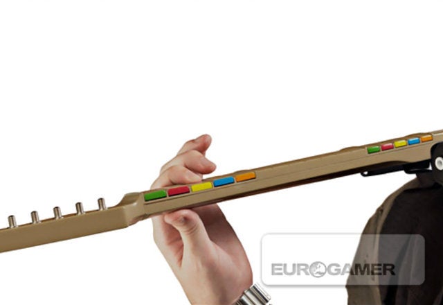 De gitaar van Rock Band, de Fender Stratocaster, is niet de beste gitaar die uit de handen van Harmonix voortgevloeid is. Het indrukken van de knoppen gaat gepaard met een gevoel van onmacht. Het lijkt alsof de knoppen niet altijd even precies reageren op datgene wat je wilt en de strumbar maakt niet dat kenmerkende klikje wanneer je hem aanslaat. Wij speelden Rock Band dan ook liever met onze oude vertrouwde X-Plorer gitaar, die trouwens perfect werkt met de game.