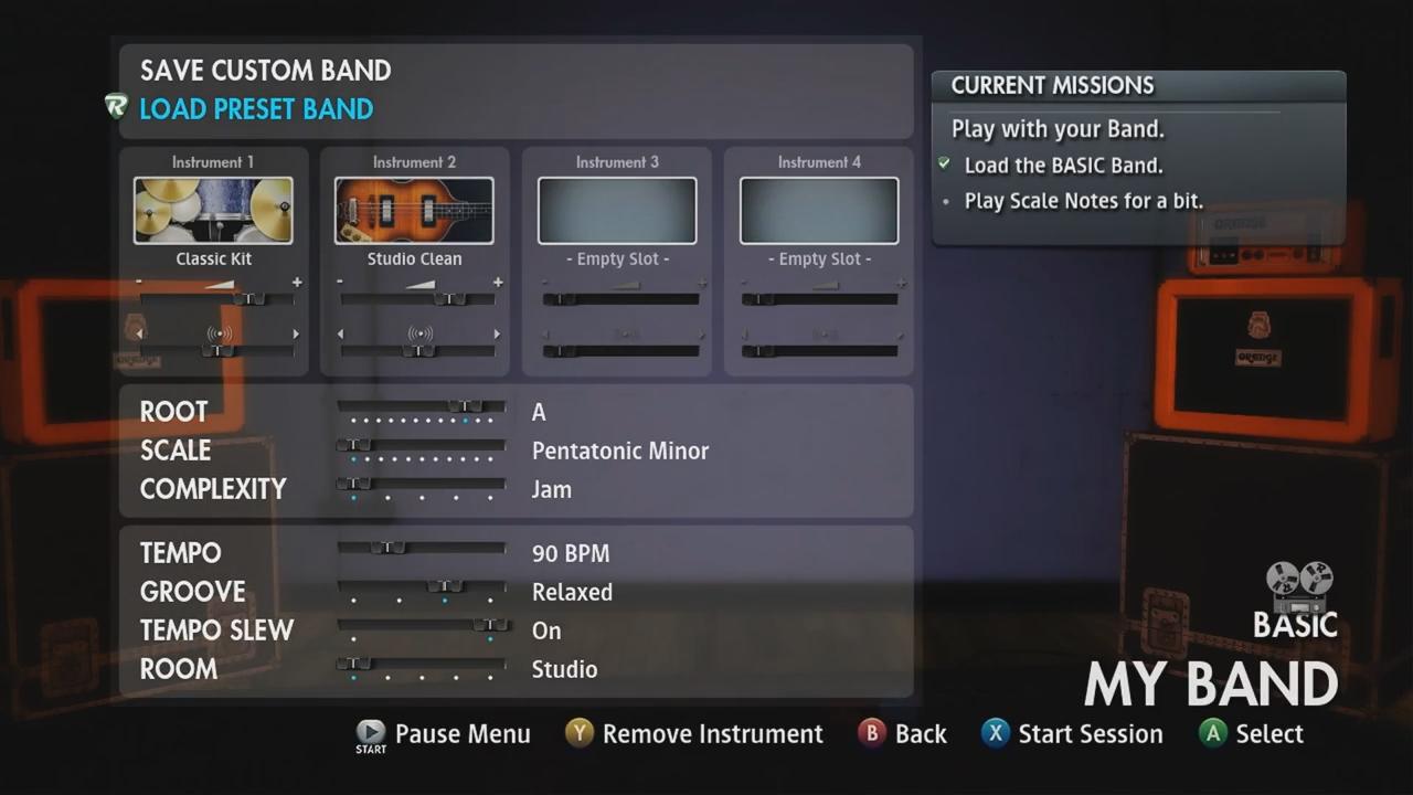 Maar een echte rockster houdt het niet bij het naspelen van songs. Bob Dylan werd niet groot door Broeder Jacob tot in de perfectie te spelen. Je kunt dan ook min of meer je eigen nummers schrijven in Session Mode. Hierin kun je een jamsessie starten waar je zonder enige druk kan spelen. Zo kies je zelf je eigen gitaargeluid in de tone designer. Mede door de mogelijkheid om downloadbare uitbreidingen uit het eerste spel in te laden, kan je bijna alle kanten op met je sound. Vervolgens stel je een begeleidingsband op die klinkt zoals jij het wil. Eens jij begint te spelen, valt de groep in.