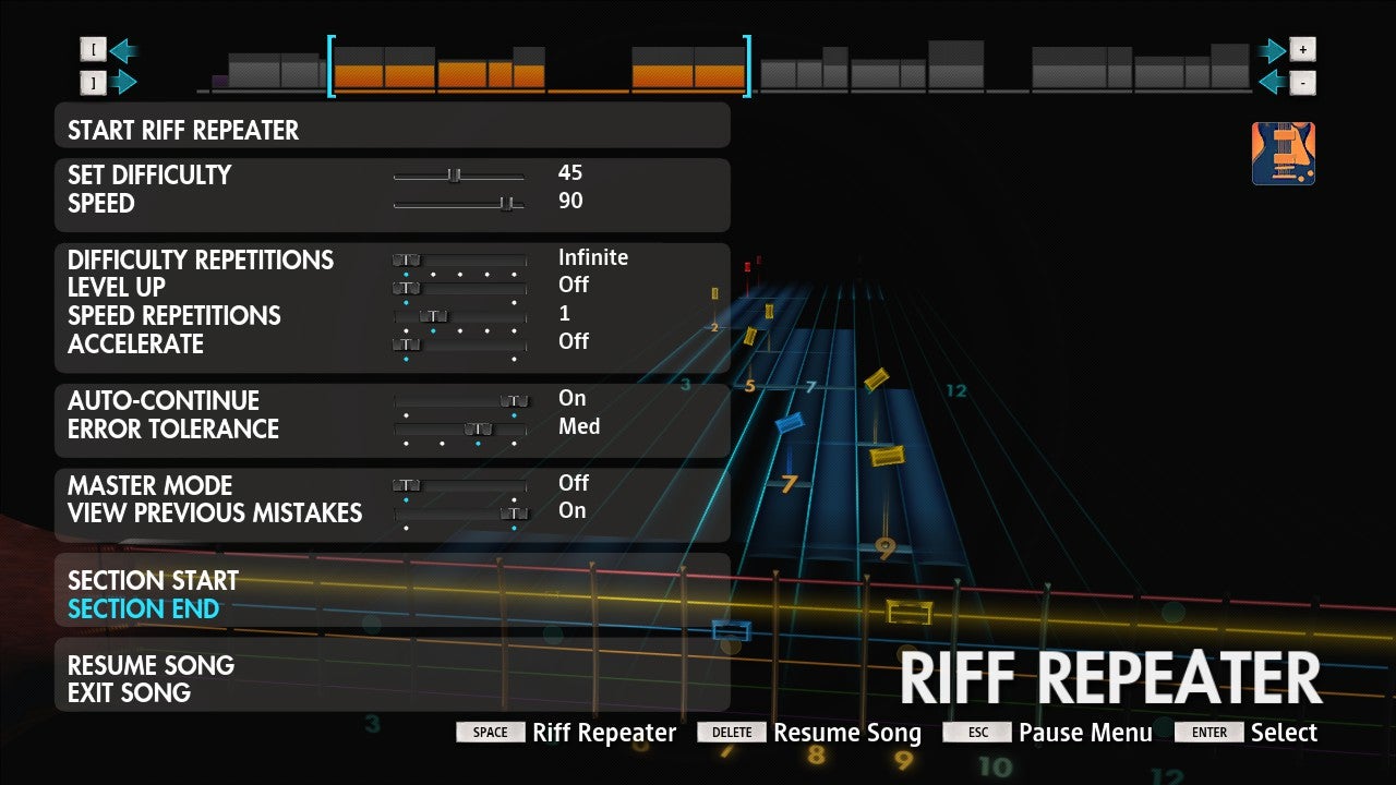 Als je een moeilijk stuk maar niet onder de knie krijgt, ben je genoodzaakt om de riff repeater te gebruiken. Waar je vroeger eerst in het pauzemenu die tool moest openen, kan dat nu met één druk op de knop. Nog maar eens een bewijs dat het Rocksmith 2014 gestroomlijnder is. Ondanks de vele opties die je in de riff repeater voorgeschoteld krijgt, is de opzet duidelijk. Je duidt aan welk stuk je wil oefenen, stelt tempo en moeilijkheidsgraad in en begint te spelen. De game laat weten hoeveel noten je mist en welke stukken je aandacht vereisen.