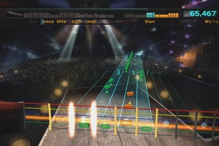 De interface van Rocksmith bestaat uit zes snaren onderaan en lyrics bovenaan (je stemgeluid is jammer genoeg - of gelukkig - niet registreerbaar), de rest van het scherm wordt in beslag genomen door verticale streepjes die een twintigtal frets moeten voorstellen. Frets zijn de ijzeren staafjes in de nek van de gitaar waar je de snaren die je bespeelt tegen moet drukken. Aangezien de frets onmogelijk allemaal tegelijk op je tv-scherm passen zoomt de camera telkens uit bij wijze van aankondiging dat hij binnenkort naar een ander deel van het fretbord zal verschuiven. Dat werkt erg vlot, maar het neemt niet weg dat je als beginnend gitarist voortdurend je blik zult moeten wisselen tussen je gitaar en tv omdat je nog niet aanvoelt waar alles zich precies bevindt op het instrument.