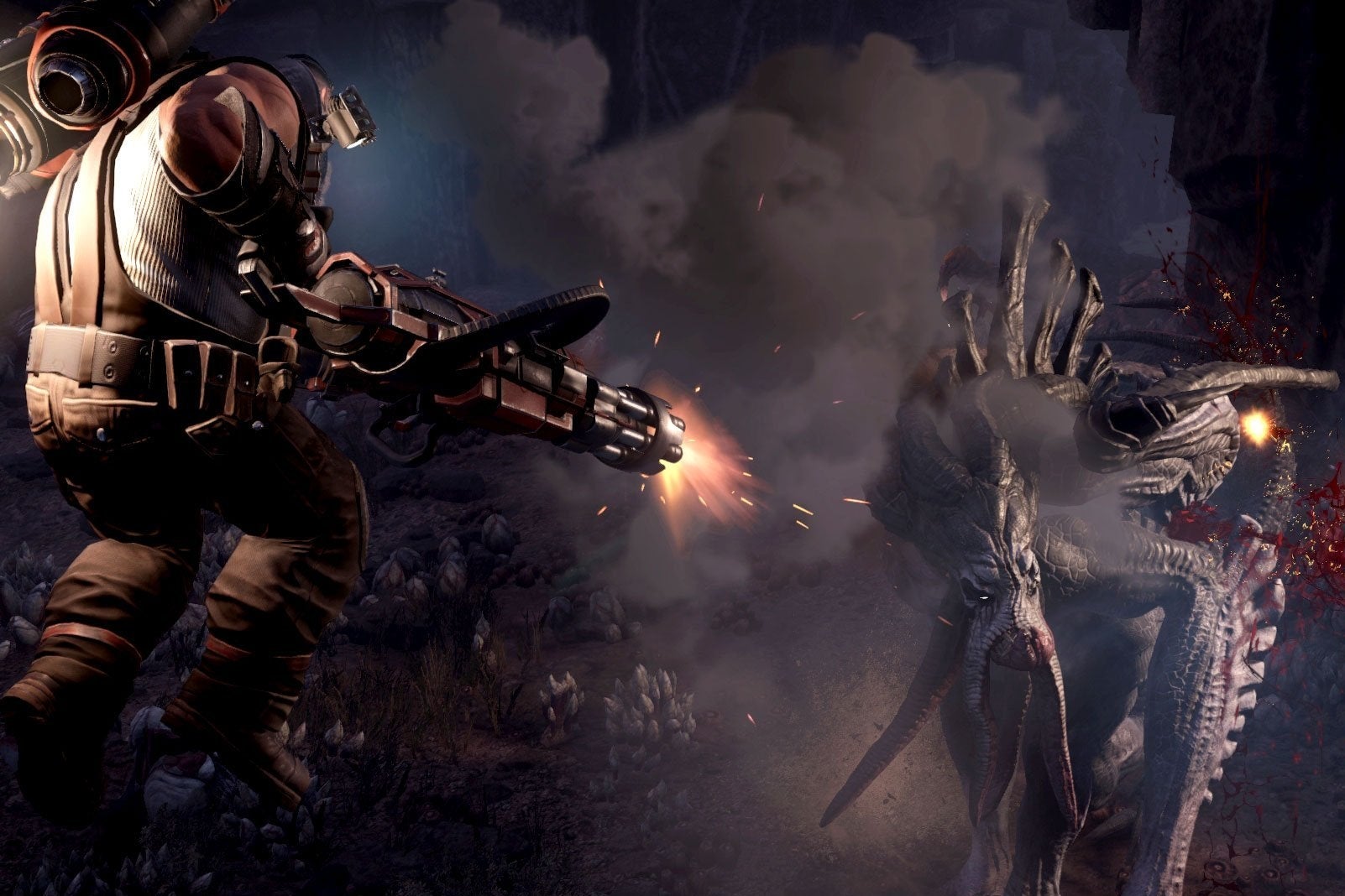 Er heerst chaos onder mijn teamgenoten. Nog niet iedereen is bekend met de besturing van zijn klasse in Evolve. Er wordt dus flink wat gerommeld met alle opties terwijl we een ervaren speler proberen bij te houden. Die speelt als de Trapper Maggie-klasse en laat weten dat we ons doelwit op het spoor zijn. Als kippen zonder kop openen we het vuur op het eerste beste grote monster dat we zien. Deze gaat al snel ten onder. 'Zo makkelijk kan het toch niet zijn?', vragen we ons luidop af. Een moment om op adem te komen krijgen we echter niet. Een gigantisch wezen doemt voor ons op en opent zonder genade het vuur. De jacht is nu echt begonnen en het is tijd om mijn taak als Medic te volbrengen.
