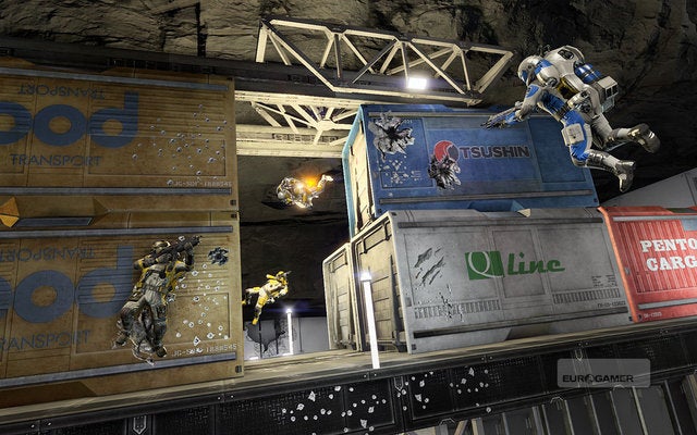 Je zicht op de actie gaat door het Metroid Prime-aandoend vizier van je ruimtepak uit de nabije toekomst (met raketten eraan, betekent dat). Twee teams, Aarde en Corporatie, blauw en geel, in skirmish of control point games. Allen volledig ontketent, gewapend met een ruimtegeweer.