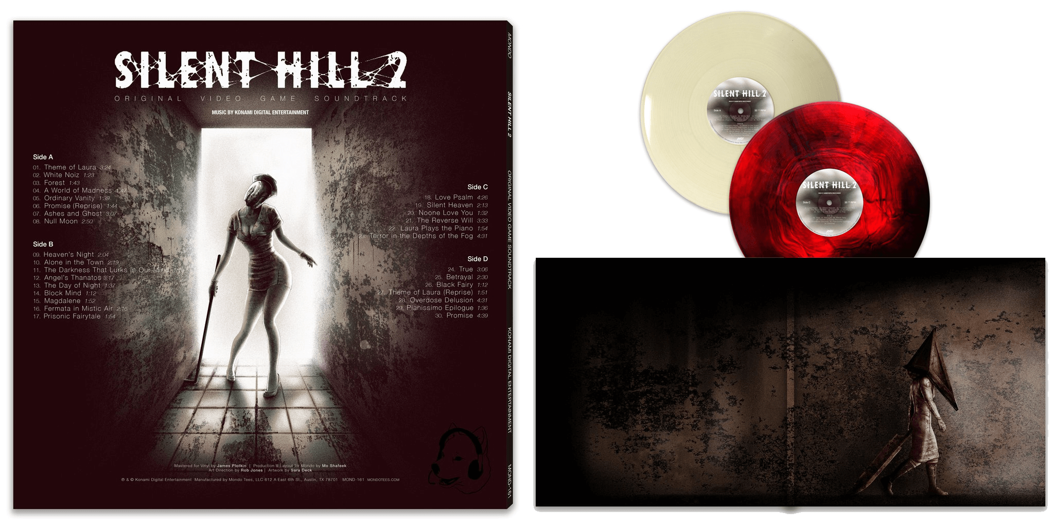 In de hoes vind je twee dubbelzijdige LP's, eentje met witte en eentje met rode opdruk. In totaal zijn er dertig nummers te luisteren, waaronder Theme of Laura en Promise (Reprise). Op de hoes zelf is artwork van de game te zien, inclusief Pyramid Head.