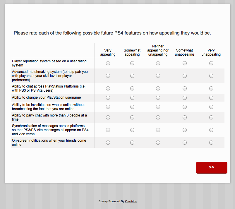 Zo vraagt Sony onder andere hoe graag de consumenten hun PlayStation Network-naam willen veranderen. Ook vraagt het bedrijf of er een reputatiesysteem nodig is op het online platform. Daarnaast wordt een vraag gesteld over de behoefte van een geavanceerd matchmaking-systeem, waarmee je bij spelers van je eigen niveau wordt geplaatst.