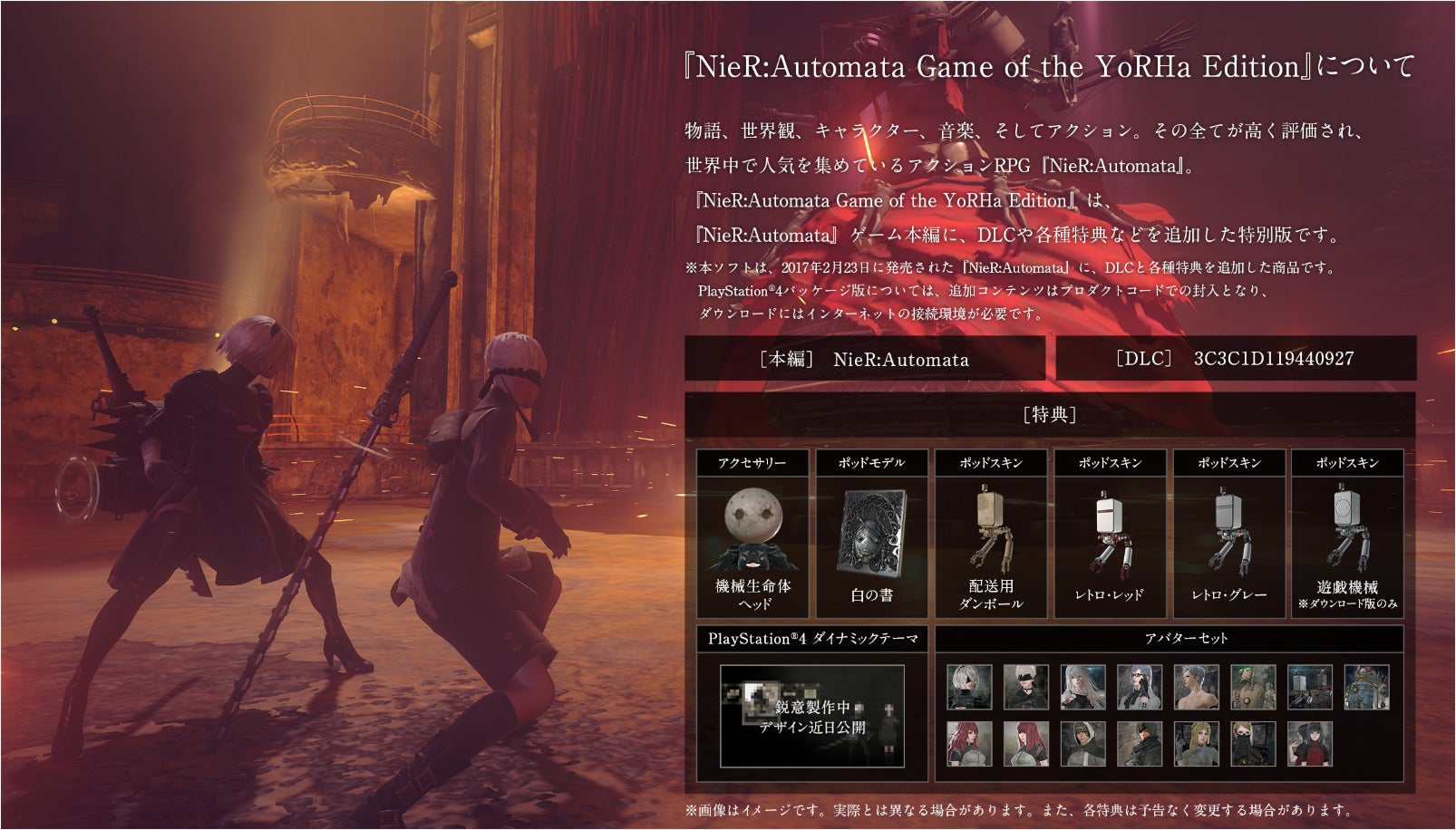 Naast de hoofdgame krijg je er automatisch toegang mee tot de 3C3C1D119440927-DLC, die bestaat uit gevechten in een afgesloten arena. Win ze allemaal om drie extra outfits voor de personages te ontgrendelen: de Revealing Outfit voor 2B, de Young Man's Outfit voor 9S en de Destroyer Outfit voor A2.