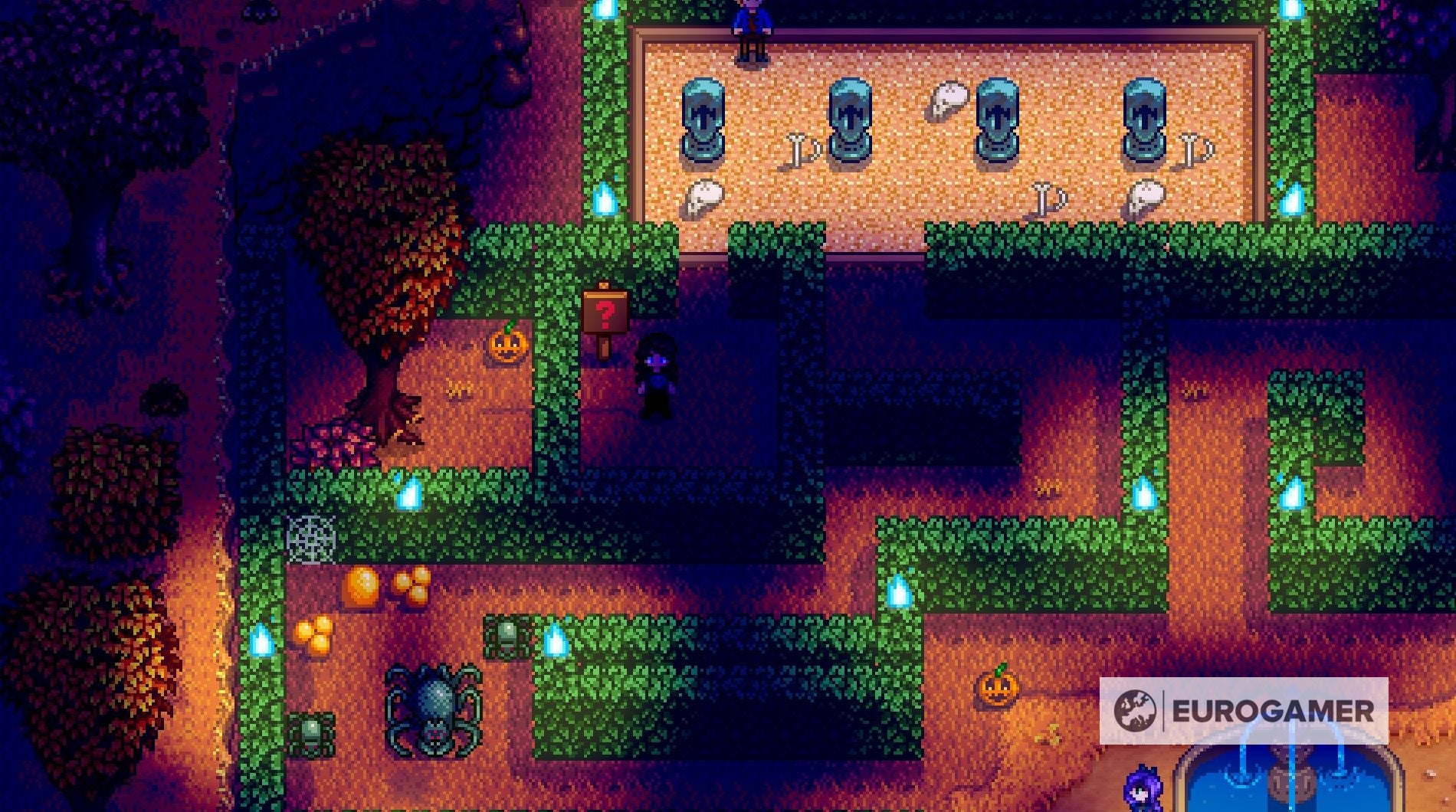 In tegenstelling tot de Stardew Valley Fair, is Spirit's Eve zeker niet een familievriendelijk evenement. Er zijn opgesloten skeletten op het plein, je kunt Jack-O-Lanterns kopen en het engste onderdeel is toch zeker wel de Haunted Maze.