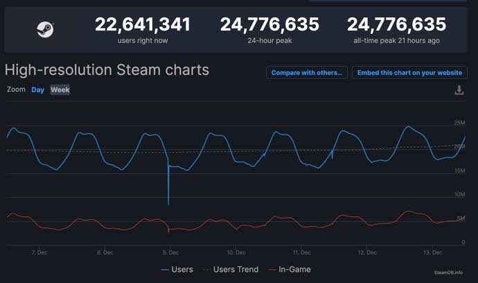 Steam bereikte onlangs de kaap van 24,7 miljoen gelijktijdige spelers en breekt daarmee al voor de zesde keer dit jaar zijn eigen record. Deze keer is dat waarschijnlijk te wijten aan het koude weer, de huidige pandemie en de goede releasecijfers van Cyberpunk 2077.