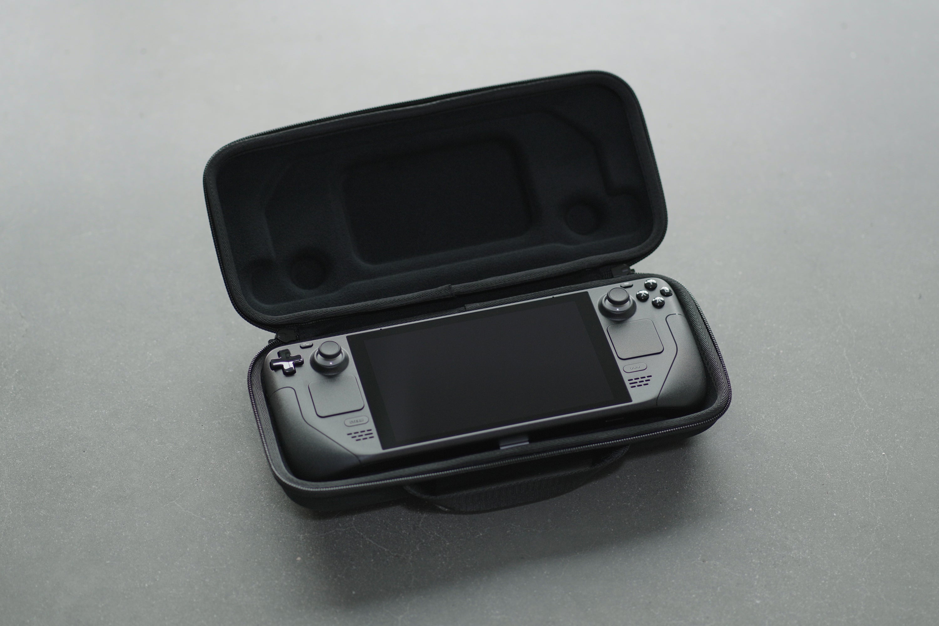 Op de volgende foto zie je dan weer een nog dichtgeritste beschermhoes met het logo van de hybride pc op. Op de twee laatste foto's zie je de opengeritste versie van het etui en de huidige versie van het Steam Deck. Die versie doet dienst als developer kit en is het laatste prototype voor het uiteindelijke product.