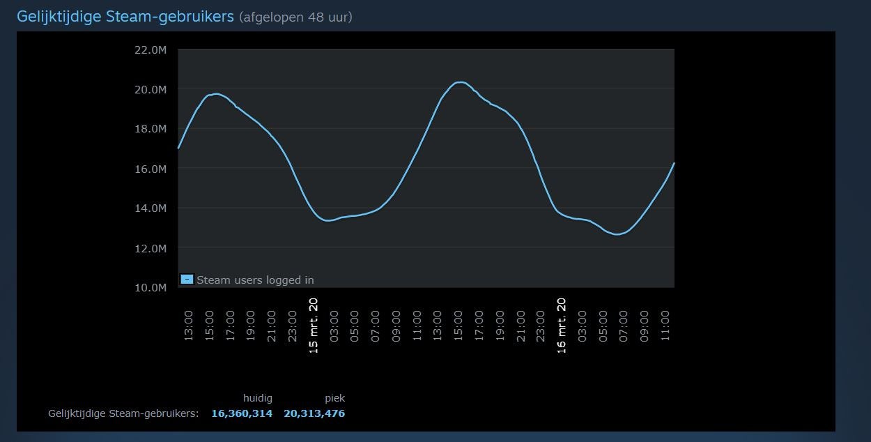 Het lijkt er erop dat het Corona-virus ook positieve gevolgen heeft. Nu binnenblijven de beste oplossing is, waren er dit dit weekend meer gelijktijdig ingelogde spelers dan ooit actief op Steam. Het vorige record dateert van vorige maand, toen piekte het aantal gelijktijdige gebruikers op bijna 19 miljoen gelijktijdige gebruikers.
