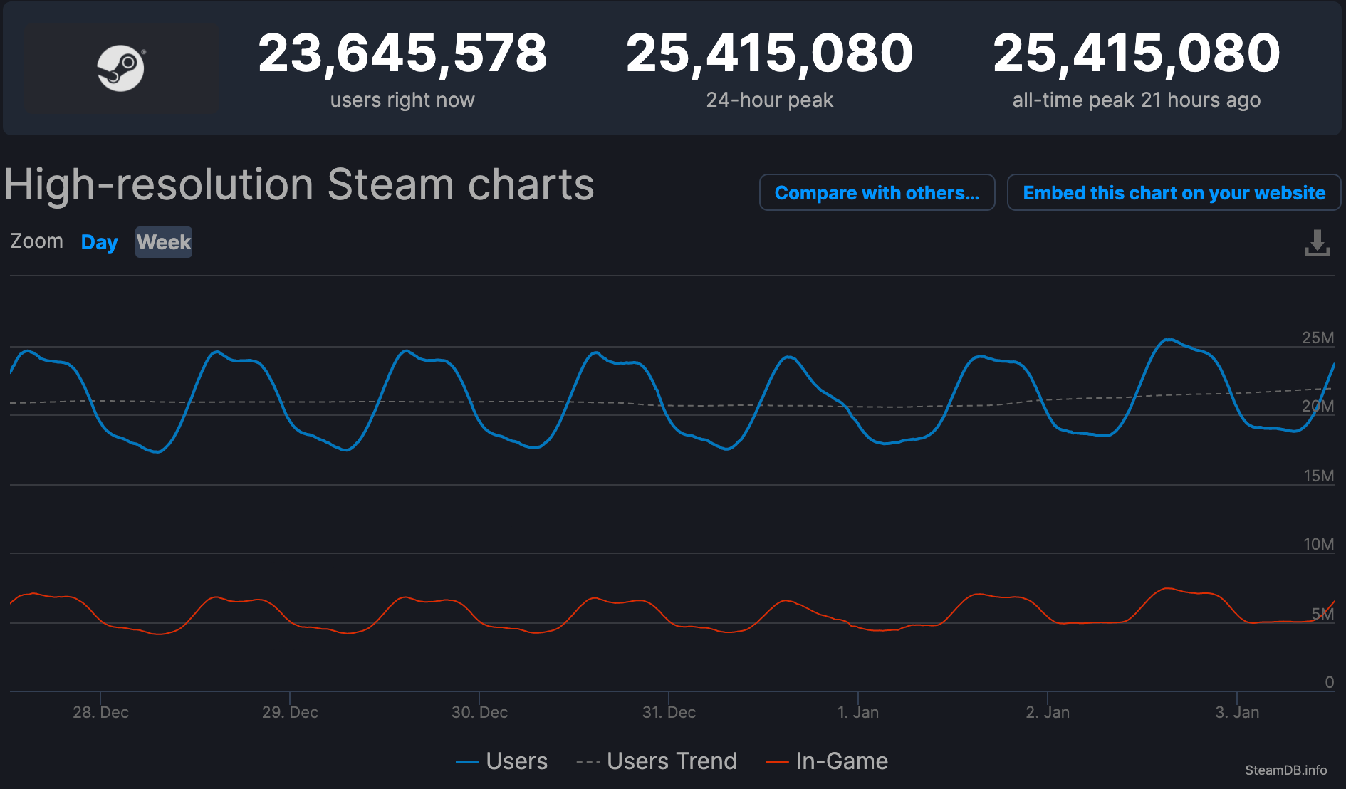 Valve start het nieuwe jaar met een nieuw recordaantal gebruikers op Steam. Op 2 januari had het platform 25,4 miljoen gelijktijdige gebruikers. Het is al de zevende keer op twaalf maanden tijd dat dat record sneuvelt.