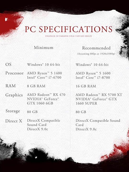 Square Enix onthult de systeemvereisten voor de pc-versie van Stranger of Paradise: Final Fantasy Origin via Twitter. Die vereisten zijn onderverdeeld in minimale en aanbevolen vereisten en spelen respectievelijk 720p aan 30 FPS en 1080p aan 60 FPS.