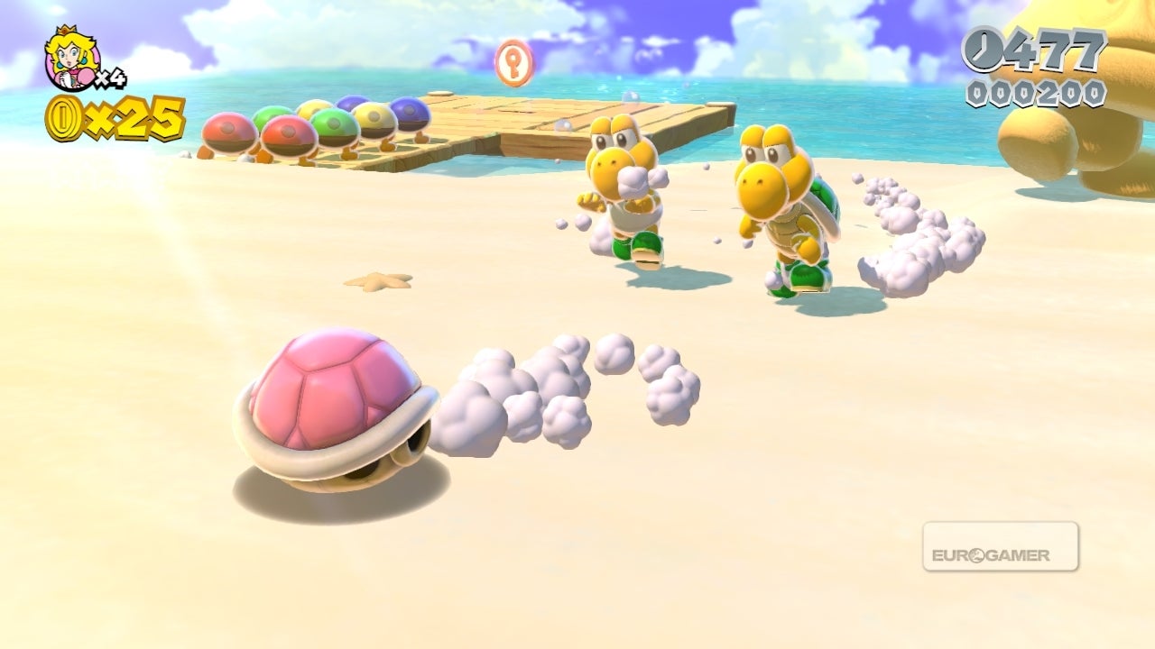 New Super Mario 3D World komt daarbij dan wel op uit op dezelfde dag als de PlayStation 4, grafisch staat de game zeker zijn mannetje. De zon weerkaatst op een stralend blauwe zee, terwijl glinsterende golfjes tegen een goudgeel zandstrand kabbelen. In een ander level baadt de ondergaande zon een uitgestrekte savanne in een warme, oranje gloed. Mario gooit vuurballen in een duistere grot en schaduwen van piranhaplanten komen onheilspellend tot leven. In een pretparklevel schitteren honderden felgekleurde lampjes onder een wijde sterrenhemel.