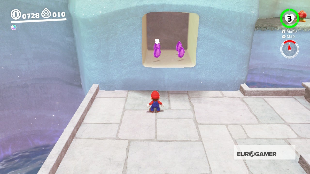 Zoek aan de linkerkant van het eerste meer (voor het luchtschip) naar een ritssluiting in het water. Gooi Cappy om de verborgen ruimte in de muur te onthullen. Wall jump naar boven en pak daar de volgende drie paarse munten.