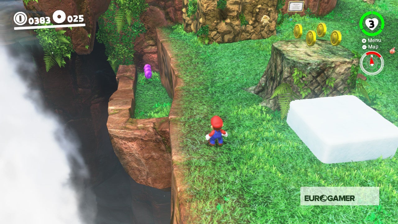 Loop eromheen totdat je een witte hoed marker tegenkomt. Spring er overheen en je vindt een groene pijp, nog twee witte hoed markers en drie paarse munten. Gooi met Cappy om ze te verzamelen aangezien ze boven een afgrond zweven.
