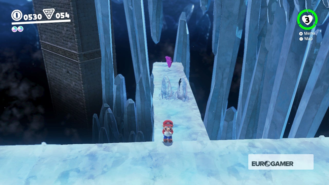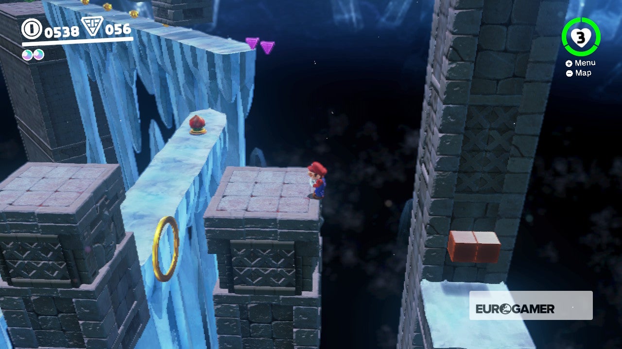 Naast het 8-bit-gedeelte op de muur vind je bruin drijfzand. Het ziet eruit als een val, maar eigenlijk is het de ingang van een geheim level. Door dit ijs-level te voltooien krijg je niet alleen een maan en checkpoint, maar tevens vijf paarse munten.