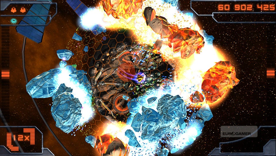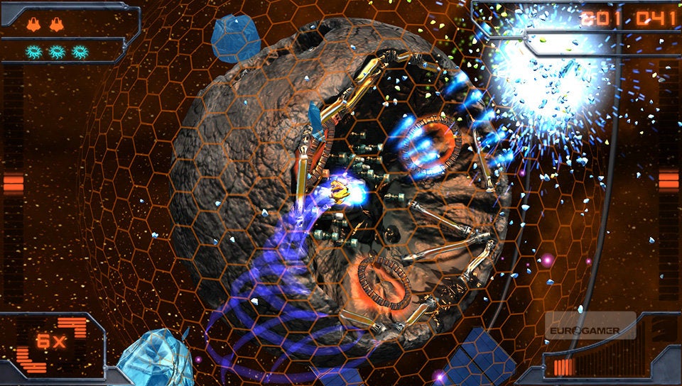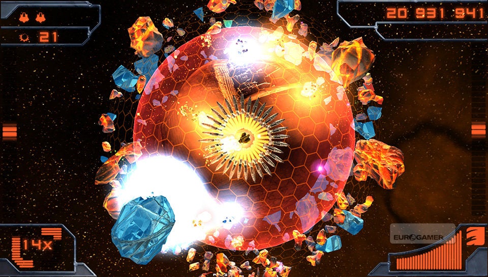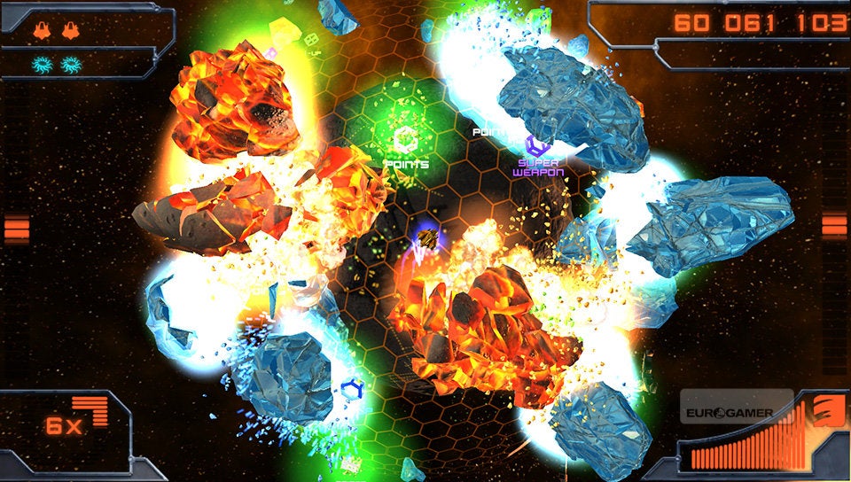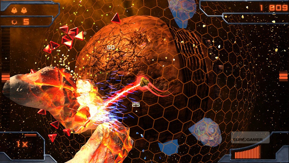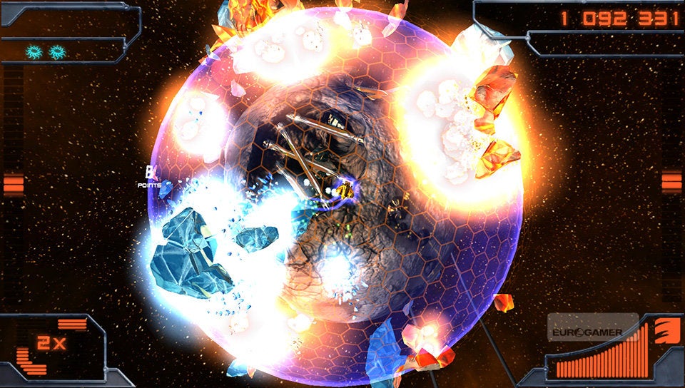 Je schip bestuur je met de twee analoge sticks. De linkse gebruik je om het schip over de planeet te vliegen en met de rechtse bepaal je de schietrichting. Simpeler kan haast niet. Je schip is voorzien van twee soorten standaardaanvallen. De vuurstraal en een ijskanon. Afhankelijk van de kleur die de vijand en asteroïden hebben, zul je het ene of het andere wapen met de rechterschouderknop moeten inschakelen. Rode wezens dien je met vuur te bestrijden en blauwe entiteiten met ijs. Met de linkerschouderknop kun je dan weer een boost activeren, waarmee je aan hoge snelheid tijdelijk ongenaakbaar bent. Erg interessant om op de meest hachelijke momenten even snel het hazenpad te kiezen!