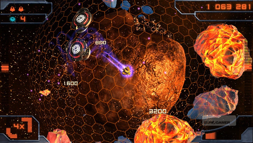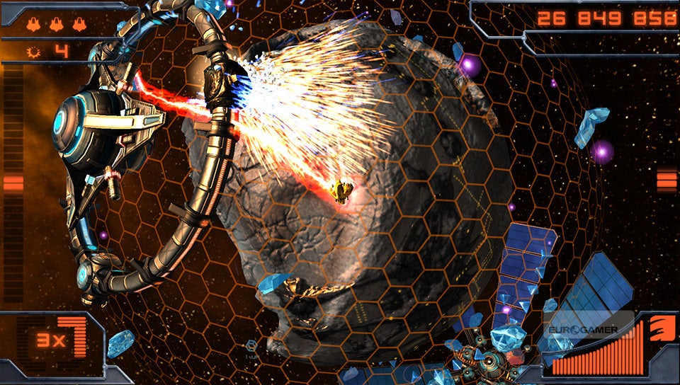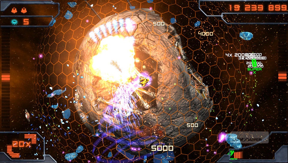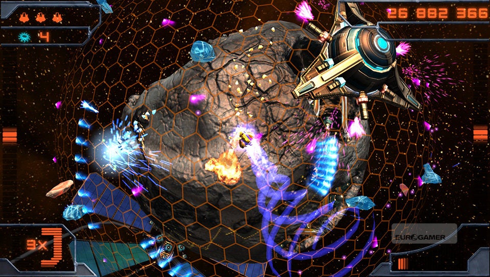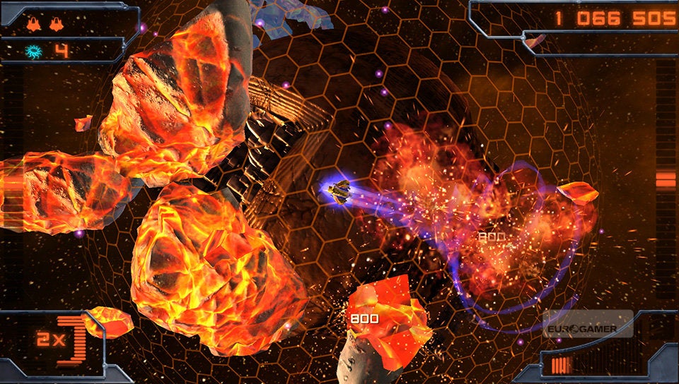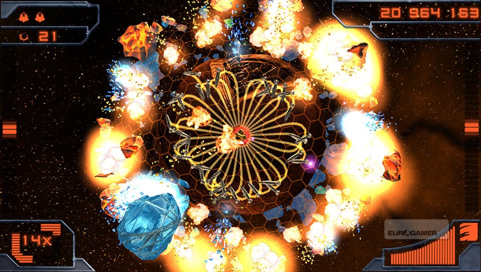 Je schip bestuur je met de twee analoge sticks. De linkse gebruik je om het schip over de planeet te vliegen en met de rechtse bepaal je de schietrichting. Simpeler kan haast niet. Je schip is voorzien van twee soorten standaardaanvallen. De vuurstraal en een ijskanon. Afhankelijk van de kleur die de vijand en asteroïden hebben, zul je het ene of het andere wapen met de rechterschouderknop moeten inschakelen. Rode wezens dien je met vuur te bestrijden en blauwe entiteiten met ijs. Met de linkerschouderknop kun je dan weer een boost activeren, waarmee je aan hoge snelheid tijdelijk ongenaakbaar bent. Erg interessant om op de meest hachelijke momenten even snel het hazenpad te kiezen!