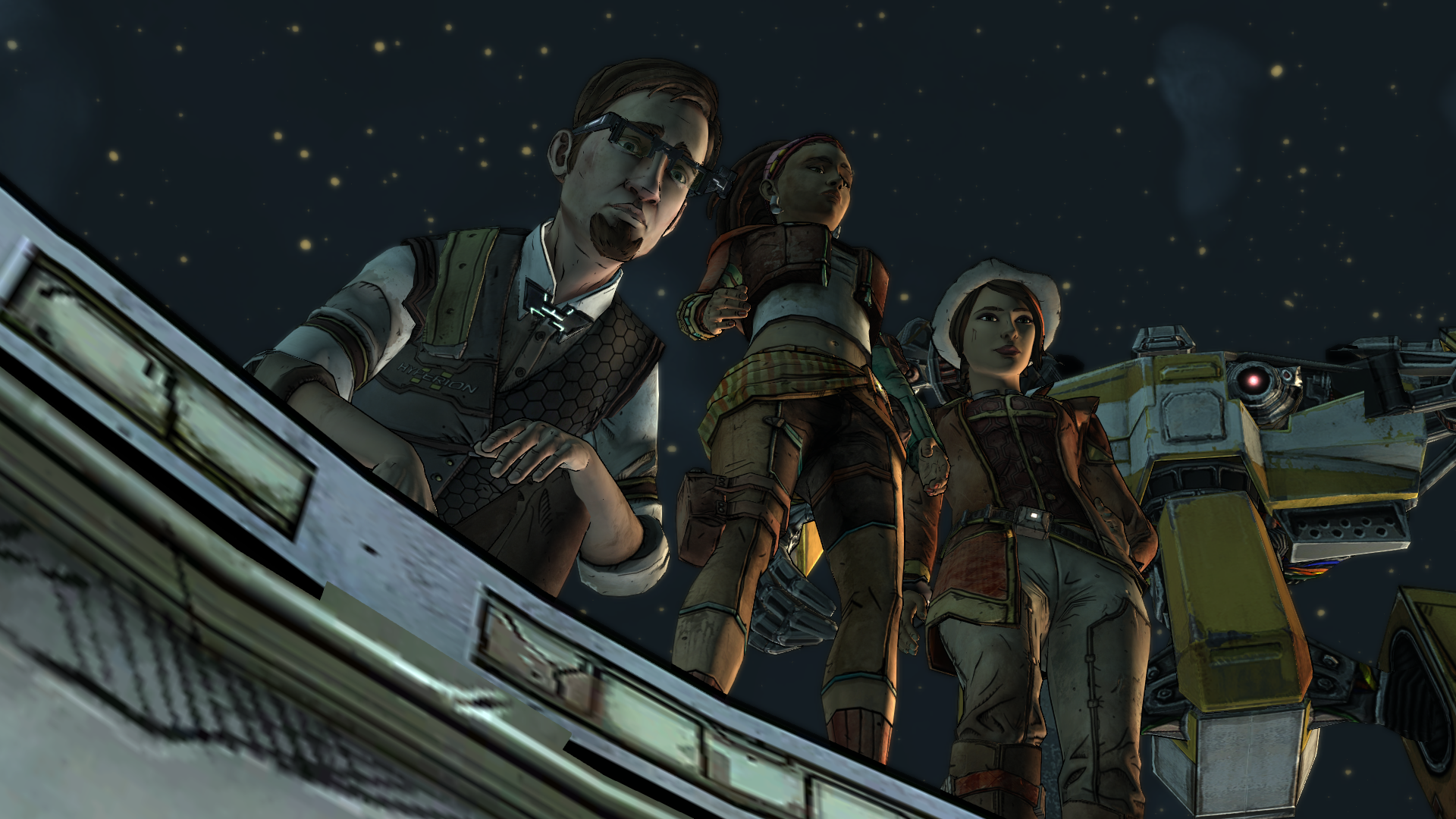 Telltale zelf ziet Tales from the Borderlands dan ook als een terugkeer naar de roots. Dat merk je ook al snel. Hoofdpersonage Rhys wordt dankzij agressieve onderhandelingen (en een luchtsluis) van een welverdiende promotie beroofd. Daarna smeedt hij samen met zijn kompanen een plan om zijn nieuwe baas een hak te zetten. Iets wat in ware Borderlands-stijl onmiddellijk uit de hand loopt. Het moment waarop Rhys en zijn beste vriend de oppervlakte van Pandora voor de eerste keer bereiken en onderweg wat fauna en flora van de weg maaien, blijft je gegarandeerd bij.