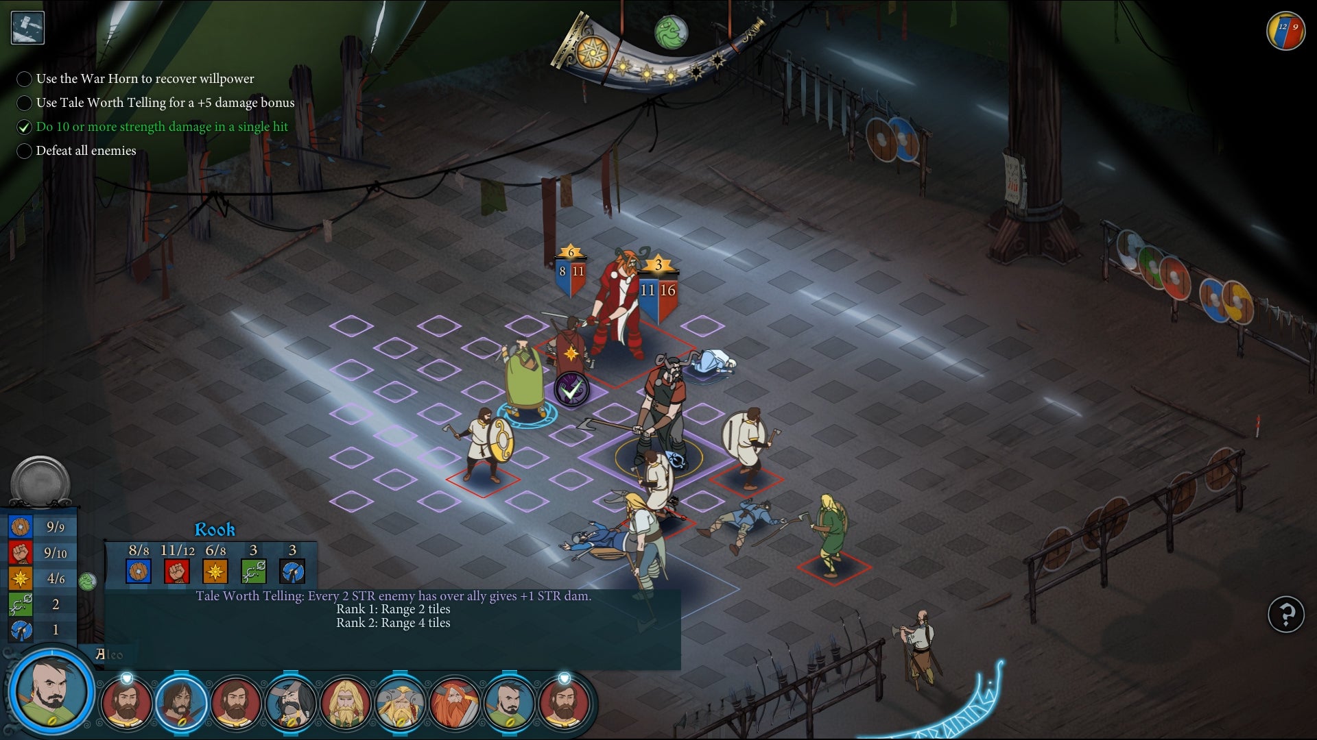 Met nieuwe classes en een nieuw ras, diept The Banner Saga 2 de tactiek nog verder uit. Neem bijvoorbeeld de nieuwe Poet die met een belediging de beurt van een vijand kan uitstellen. De horseborn zijn dan weer een mobiele bedreiging omdat ze na hun aanval nog kunnen bewegen. De sterktes en tactieken van elk personage worden bovendien dankzij nieuwe challenges bij de trainer in je kamp zorgvuldig uit de doeken gedaan. Die kennis is ook nodig want de gevechten zijn hier dynamischer en uitdagender dan in het origineel. Zo moet je bijvoorbeeld een sterke vijand verslaan zodat de rest op de vlucht slaat of een leger tegenhouden terwijl je magiërs een ingestorte weg repareren. Niet elk scenario is even geslaagd, zoals bijvoorbeeld een baasgevecht die alle spelregels op zijn kop zet, maar de afwisseling weet wel je aandacht vast te houden.