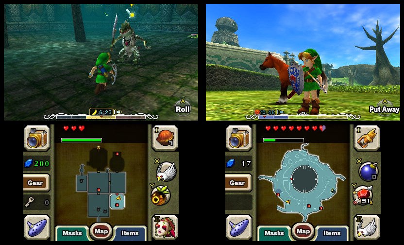 Wil je de apocalyptische cyclus doorbreken, dan moet je vier tempels doorlopen. Hierbij maak je gebruik van vertrouwde voorwerpen zoals de Hookshot en de Hero's Bow, die je dankzij de gyroscoop van de Nintendo 3DS nauwkeuriger dan ooit richt. Dit arsenaal wordt met verschillende maskers aangevuld. Zet een bepaald masker op en na een creepy transformatiescène spuw je als Deku Scrub zeepbellen, kegel je als Goron je vijanden omver en scheur je als Zora door de zee. Dit laatste is op de schop genomen en dat was ook wel nodig. De standaard zwemsnelheid ligt een stuk lager, wat het navigeren door de derde tempel minder frustrerend maakt.