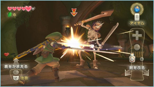 In de kerker waarmee wij aan de slag mochten gaan kwamen we bijvoorbeeld enkele snoodaards tegen die hun lichaam beschermden door hun wapens horizontaal, of verticaal voor hun lijf te houden. Op zulke momenten moet je met je zwaard de blootliggende lichaamsdelen bewerken om schade te berokkenen. En hoewel je zwaard nagenoeg perfect de bewegingen die je met de MotionPlus-controller maakt volgt, is het even wennen om Link na vijfentwintig jaar wild in het rond te laten slaan nu tactisch te laten aanvallen. Gelukkig werpt wat oefening als snel vruchten af, en eens je het systeem onder de knie hebt is zelfs het meest mondaine gevecht een strategisch hoogtepunt.