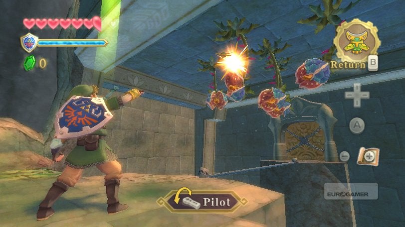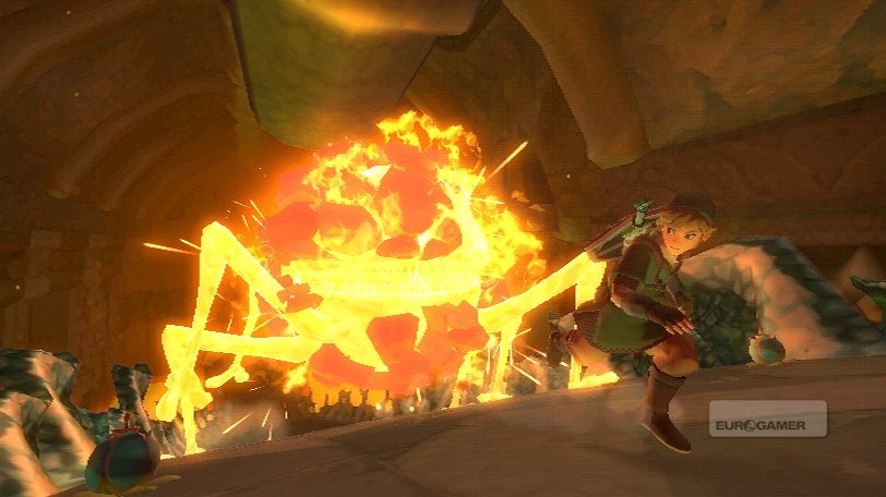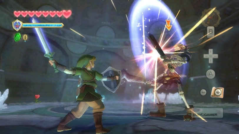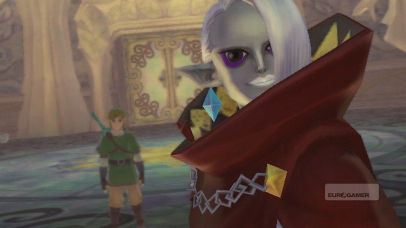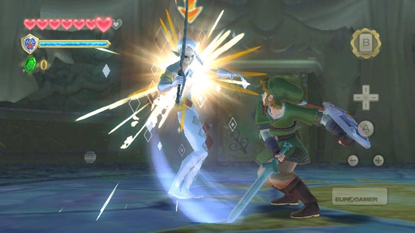 Tijdens de confrontatie met Ghirahim zagen we deze flamboyante schurk tientallen meters in de lucht springen, terwijl hij wanneer je op de verkeerde manier aanvalt met je zwaard het lemmet doodleuk met twee vingers vastpakt en je naar achteren smijt. Om hem te verslaan moet je geduldig het goede moment afwachten, om dan met je Wii-afstandsbediening op de juiste manier pijlsnel uit te halen. Dat we dit gevecht drie keer hebben moeten herstarten voordat we als overwinnaar uit de bus kwamen laat alvast zien dat Skyward Sword geen wandeling door het park zal worden.