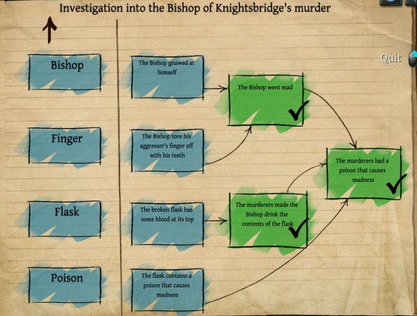 De interessantste puzzel van allemaal is bij elke zaak je 'deductiebord'. Watson houdt in zijn notitieblok keurig alle verzamelde informatie bij en dit vormt bij elkaar een grote puzzel. De gegevens die keurig op een rijtje staan moeten gecombineerd worden. En waar die in andere games vrijwel altijd voor jou wordt gedaan, mag je in dit spel zelf je hersenen er voor laten kraken. Zo krijg je op het deductionboard na elke aanwijzing drie mogelijkheden om uit te kiezen. Door te redeneren en de gevonden clues in acht te nemen kies je het goede antwoord. Dit blijft niet bij een keer, maar er moet toch zeker een keer of tien een goed antwoord worden gegeven. Bij elkaar vormt dit de reconstructie van de misdaad. Het is pittig, maar geeft voldoening wanneer je zo'n heel schema zelf op weet te lossen.