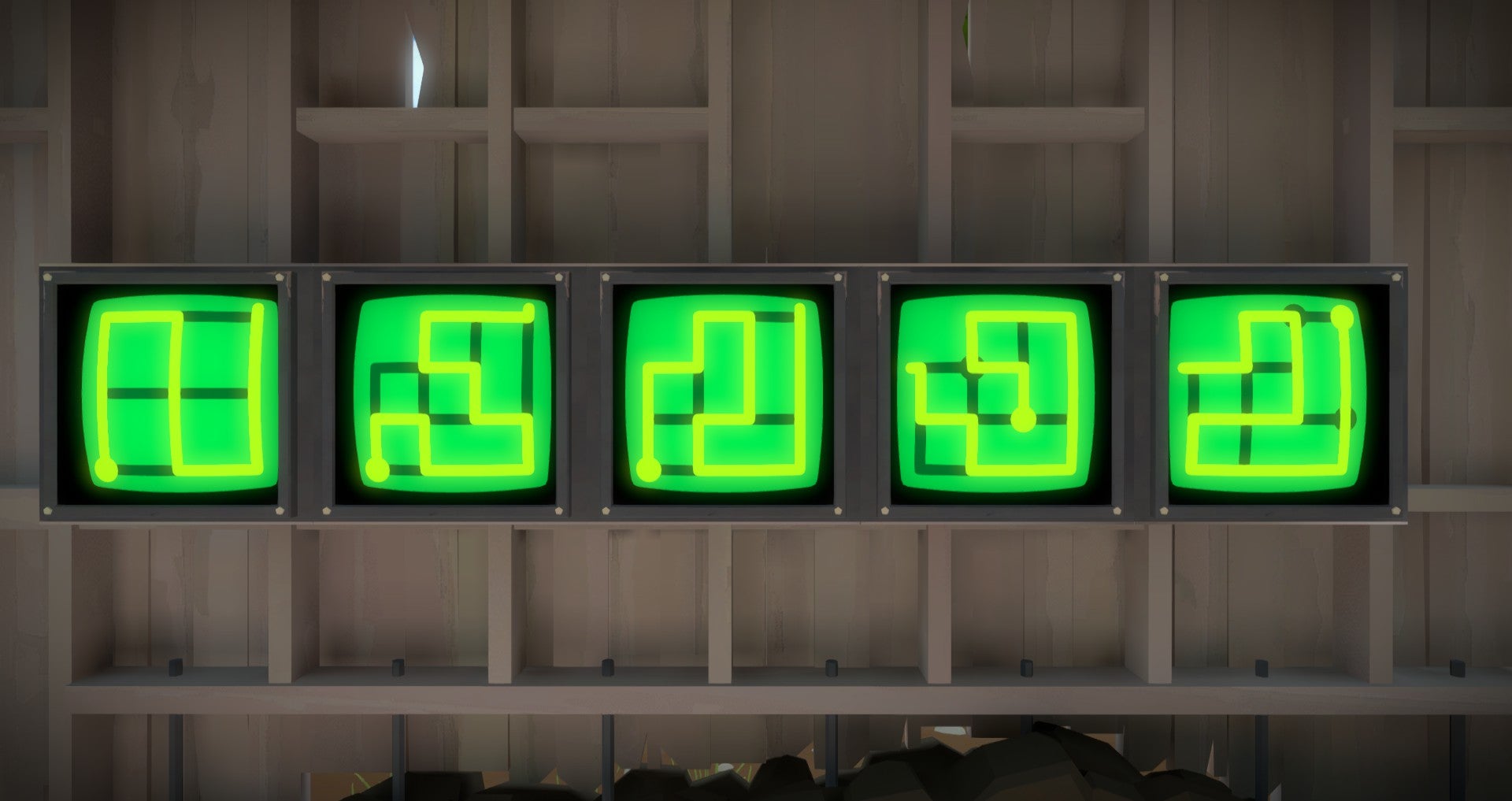 Volg het pad uit de tuin. Negeer nog even de bunker links, daar komen we later wel op terug. Ga verder tot je bij een huis met vijf schermen komt, waarvan één groen kleurt. Om deze puzzels op te lossen moet je de lijn van het beginpunt naar het eindpunt leiden en onderweg de zwarte bollen oprapen. De puzzels worden stapsgewijs moeilijker maar de kans is klein dat je hier al in de problemen komt.